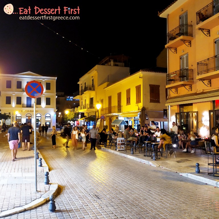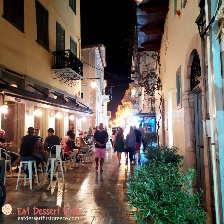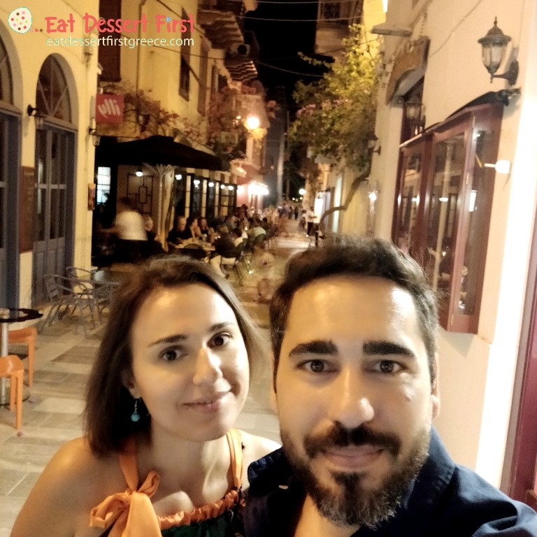 Back to our normal flow now … after enjoying our delicious meal at 3Sixty Restaurant we thought it was time for a night walk. The city of Nafplio does not sleep, since there are a lot of shops that are filled with young people, but also older people. We preferred to walk the streets and gaze at the beautifully lit buildings, against the backdrop of Palamidi castle shining at the top.