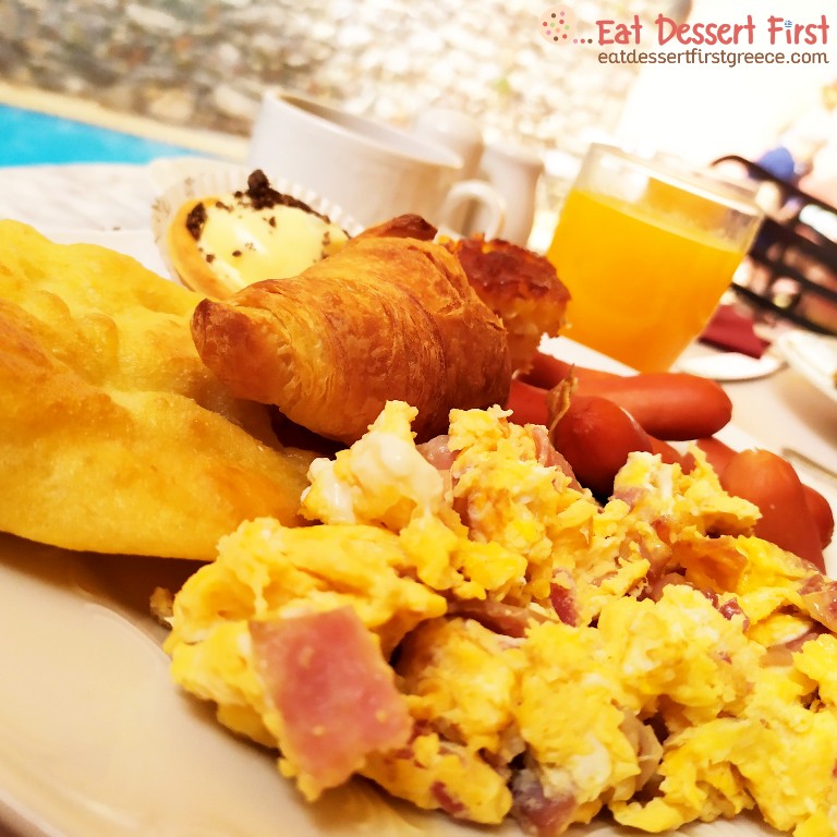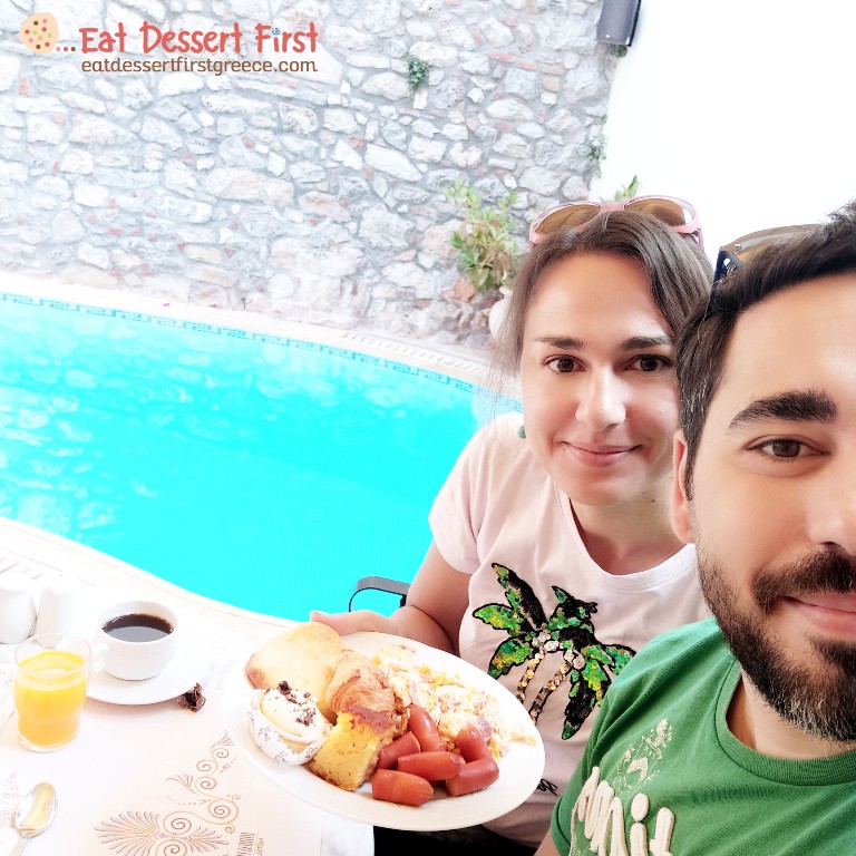 The next day dawned, the clock went off and we got ready for breakfast. A rich buffet awaited us with savory and sweet delicacies that satisfied every taste! A variety of eggs, pies, bread, rolls, cold cuts, cheeses, cakes, croissants, tartlets, sweets, yogurt, jams and whatever coffee we wanted were just a few of the options we had! We filled our dishes with the help of the staff who served us, having taken all the necessary precautions. We really tried everything and it was all fresh and delicious! To enjoy our breakfast we could sit in the dining room of the hotel, or in the beautiful courtyard with a pool.