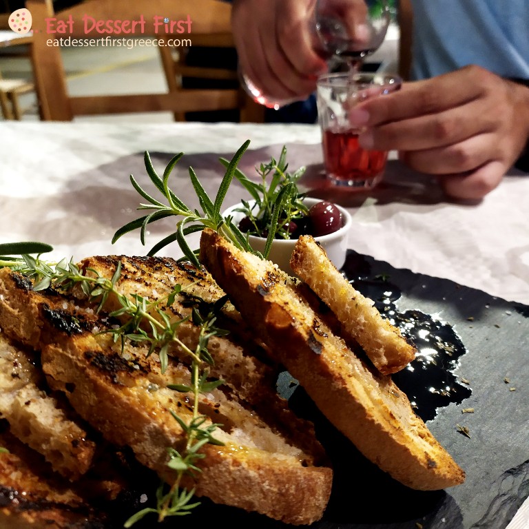 Ψωμάκι με τοπικό εξαιρετικό παρθένο ελαιόλαδο και ελιές Καλαμών και τοπικό κρασί ροζέ Αργιωργίτικο της Οινομεσσηνιακής