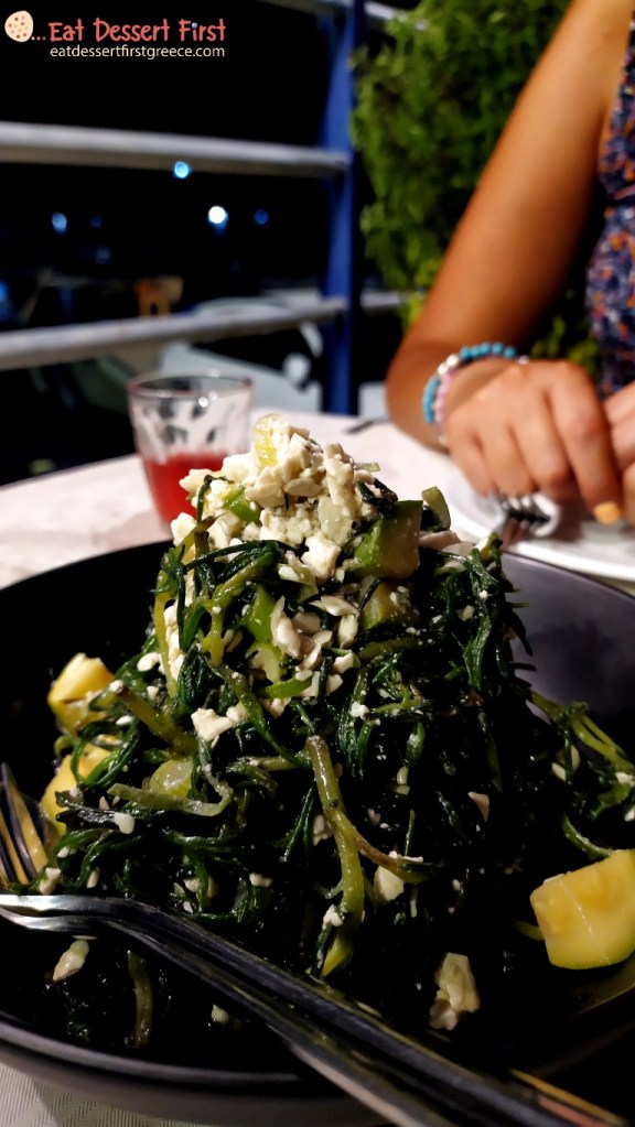 Σαλάτα αρμυρίκια -μιας και ειναι και η εποχή τους- μαζεμένα από το λιμανάκι της Κορώνης με κολοκυθάκια από το μποστάνι τους, σκορδόλαδο, φρέσκο κρεμμύδι και φέτα