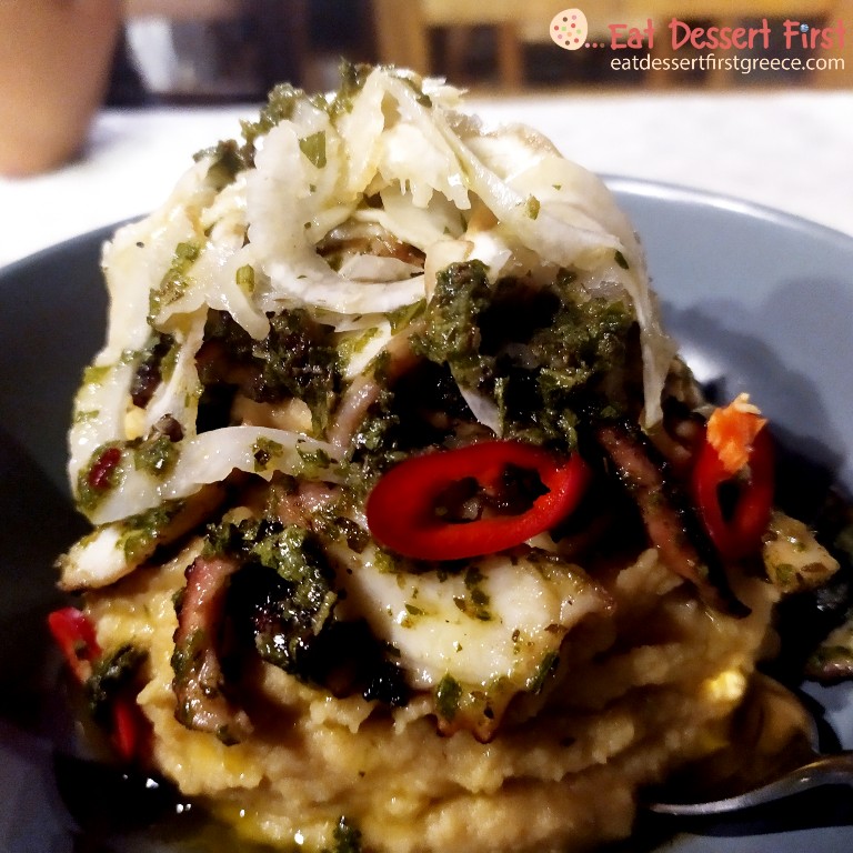 Φάβα Σαντορίνης με χταποδάκι κονφί, μαριναρισμένο φινόκιο και σάλτσα τσιμιτσούρι με τοπικά μυρωδικά με μυστική συνταγή