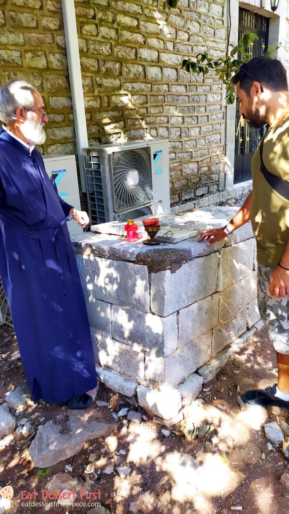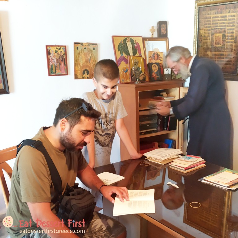 Ο εφημέριος μας μίλησε με πολύ αγάπη για τα χωριά της περιοχής και για το μοναστήρι! Μας έκανε να νιώσουμε πολύ οικεία, σαν να μιλάμε με ένα φίλο μας, μας έβαλε μέσα στα δωμάτια του μοναστηριού και μας έδειξε πολλά όμορφα πράγματα, έψαξε με ζήλο δεκάδες βιβλία για να μας βρει έγκυρες λεπτομέρειες για την ιστορία του μοναστηριού και μας κέρασε σπιτικό τσιπουράκι για να μας ευχηθεί για τη μεγάλη γιορτή της Μεταμορφώσεως του Σωτήρος που ήταν εκείνη την ημέρα… Κάναμε και πολλές κουβέντες για πολλά και διάφορα θέματα, μιας και ο εφημέριος ήταν πολύ φιλικός και κοινωνικός και τον νιώσαμε πολύ κοντά μας. Τον ευχαριστούμε μέσα από την καρδιά μας! Το ίδιο γελαστός και συμπαθητικός ήταν και ο μικρός του γιος που βοηθούσε στα πάντα, στον οποίον ευχόμαστε να είναι γερός και να έχει καλή πρόοδο με πολύ αγάπη!
