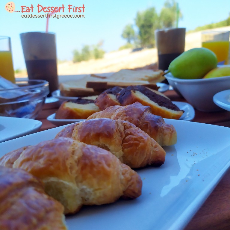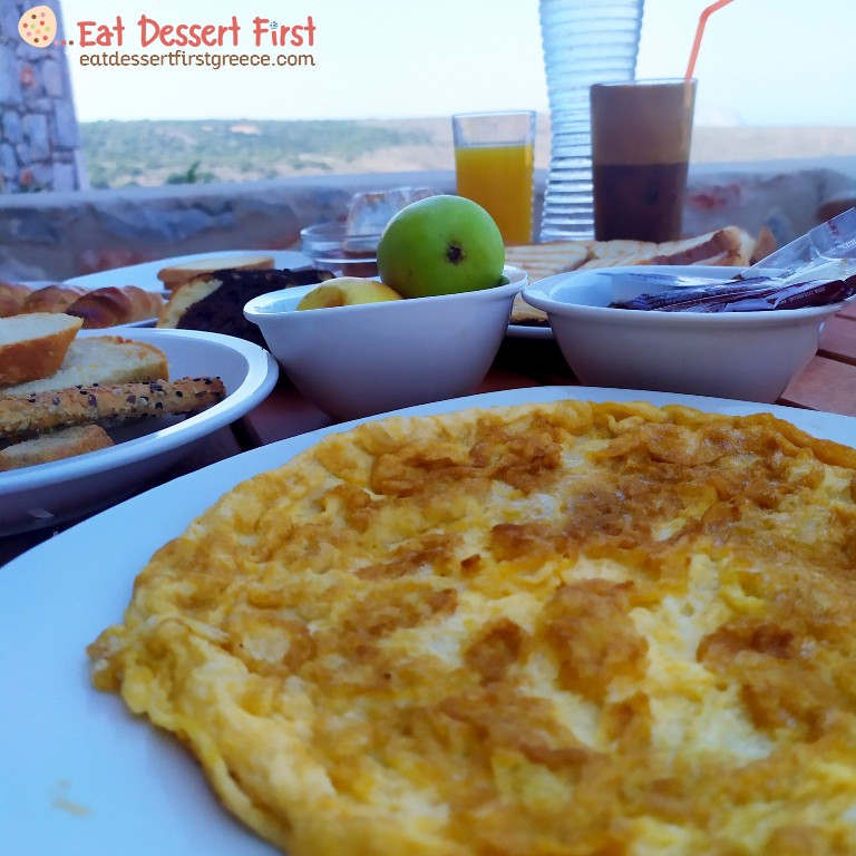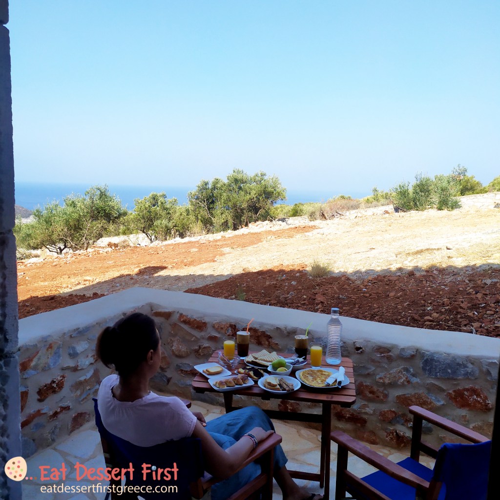 This time we chose to have our breakfast in the room. It included toasted sandwiches, bread, breadsticks, rusks, butter, honey, jam, omelette, cakes, croissants, pears, natural orange juice and coffee. We enjoyed it in the yard of our room-house, overlooking the mountain and the sea. Absolute calmness in a landscape full of contrasts…