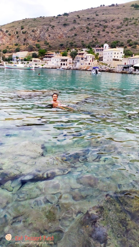 With all those interesting things that we saw in the museum, noon had arrived and the sky had begun to get cloudy… But we would not miss our swim, we would just enjoy it even more. The meteorological forecast had said that it would rain in the afternoon, so we hurried to leave Areopolis and returned to Limeni, where we had not had time to swim the day before. We left our things on a step and dived from the rocks into a crystal clear sea, overlooking the beautiful harbor. This dive will be unforgettable!
