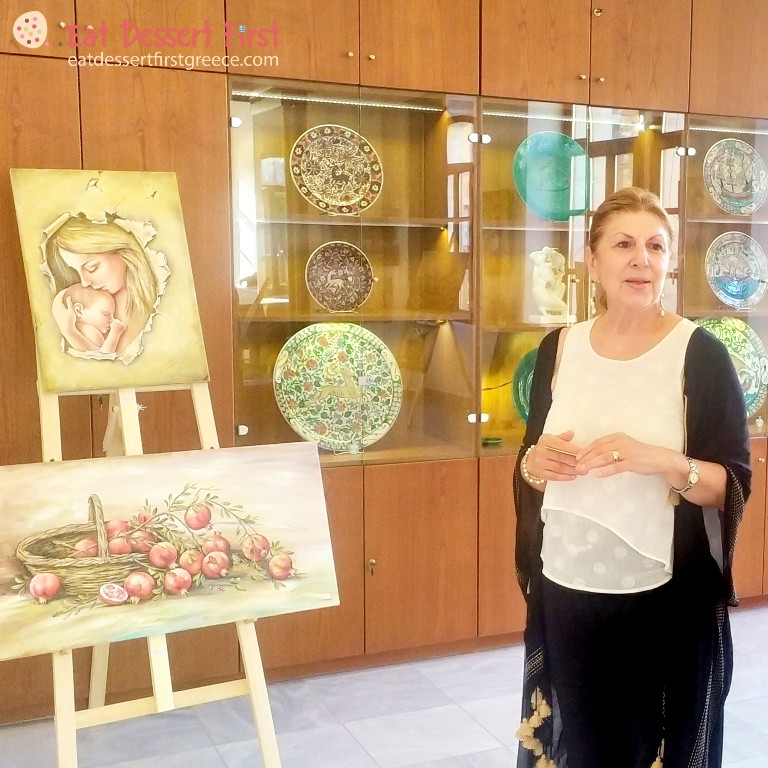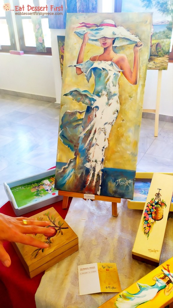 Leaving the permanent exhibition of the cultural center we met Mrs. Poly Vartzioti-Galenianou or Poulia. Poulia is the artist who exhibits her works in the periodic exhibition in one of the halls of the building. We asked her to give us a short tour and she gladly accepted.