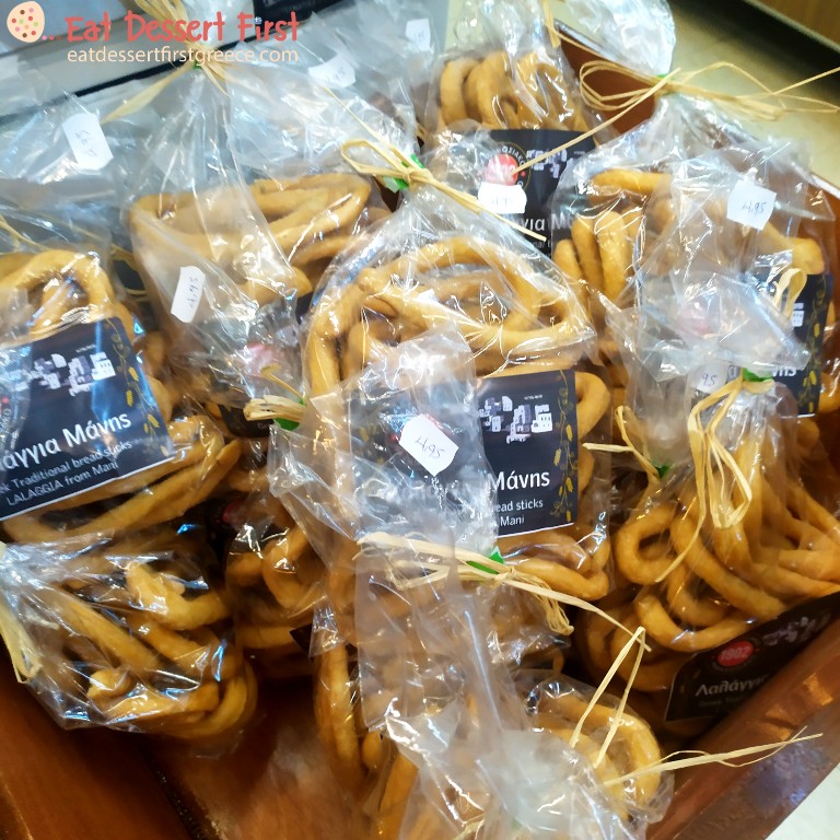 The company also has the traditional Mani lalagia. Mrs. Manolakou told us their story, which was recorded by the historian Sarantos Kargakos: In the old days, when Mani lacked many things, the mother from Mani created lalagia for the children who were upset because they did not have sweets to eat. The mother made a dough from water, salt, flour and oil and created the lalagi. She was would pour honey from her beehives on top. The children, out of their joy, would sing “la, la, la” and so the name lalagi came out!