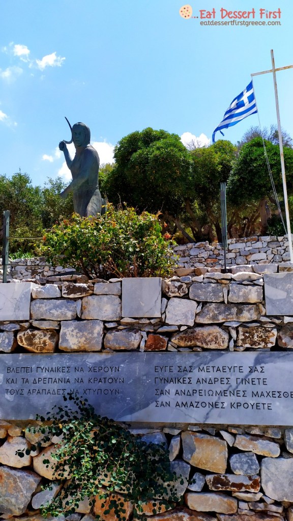Apart from the beach, near the exit of the cave we saw a statue that made a big impression on us. This is the statue of Maniatissa, the woman from Mani, who stands imposingly with a scythe in her hand, looking at the sea. In one of the brochures of the Cultural Center of the Municipality of Eastern Mani we read some things about the history of this place. We learned that in June 1826, Ibrahim’s troops attempted to land on the beach of Diros in an attempt to trap the men fighting in Verga. But they found the women determined to run into the attack with their own weapons, the scythes and the stones of their place.