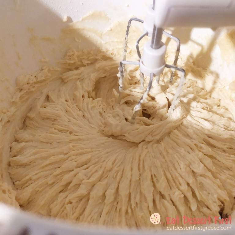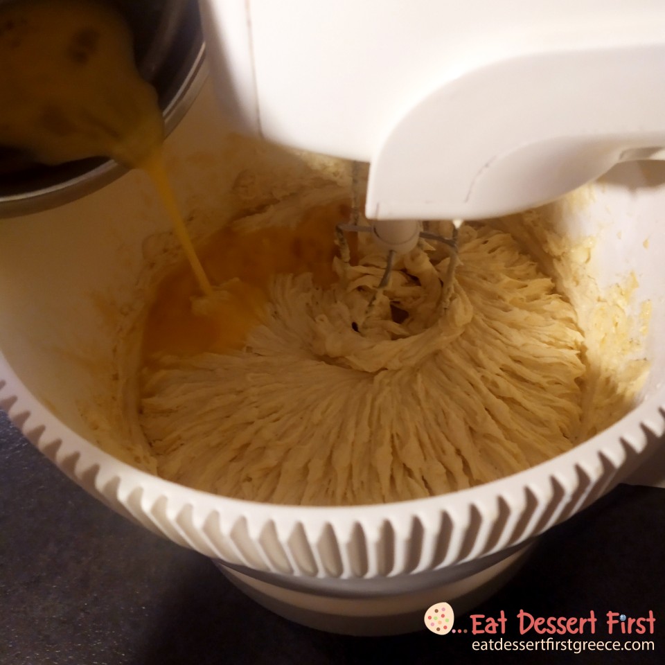 Προσθέτουμε το βούτυρο και το μισό μείγμα αυγών. Χτυπάμε ελάχιστα στο χαμηλό και για ένα λεπτό στο δυνατό να αφρατέψουν. Μαζεύουμε το μείγμα από τα τοιχώματα με μια σπάτουλα και προσθέτουμε το υπόλοιπο μείγμα αυγών σε δύο δόσεις χτυπώντας για 20 δευτερόλεπτα κάθε φορά.