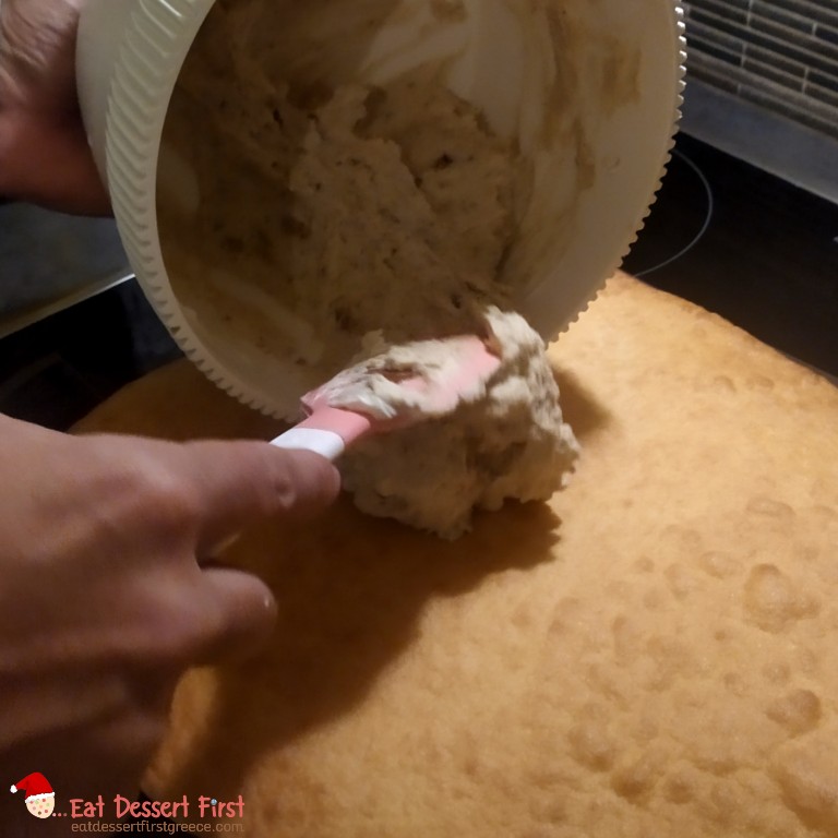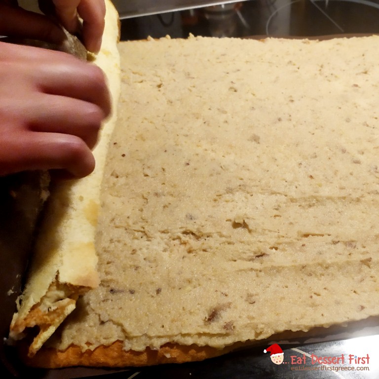 Carefully transfer the sponge cake together with the parchment paper / silicone mat from the baking tray on your kitchen counter (so that the baking tray does not prevent you from wrapping). Spread the chestnut cream all over the surface, so that the outer parts do not remain complaining. But be careful not to squeeze the cream too much so that the sponge cake does not make holes.