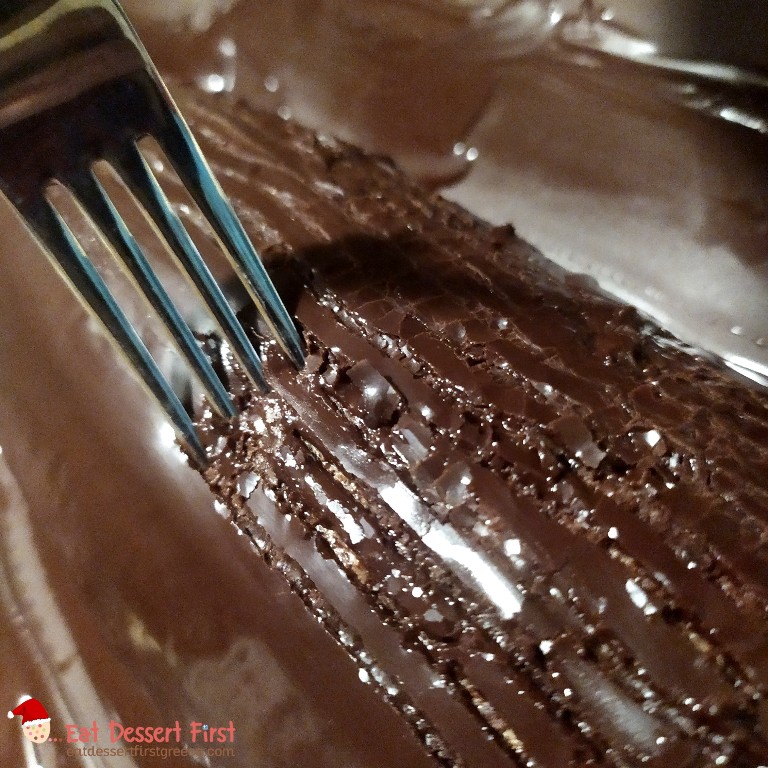 Transfer – with care not to break – the roll to a baking tray or plate (not the good one because it will be filled with chocolate). Pour over with plenty of the ganache, to go everywhere. We are not worried about the amount left on the tray, because we can keep it in the fridge for our next preparation, or eat it as it is! Wait for about a quarter for the ganache to stabilize a little, and then take a fork and carve the surface so that it looks like wood.