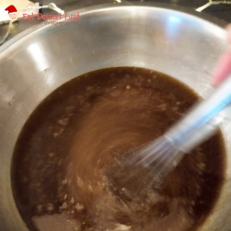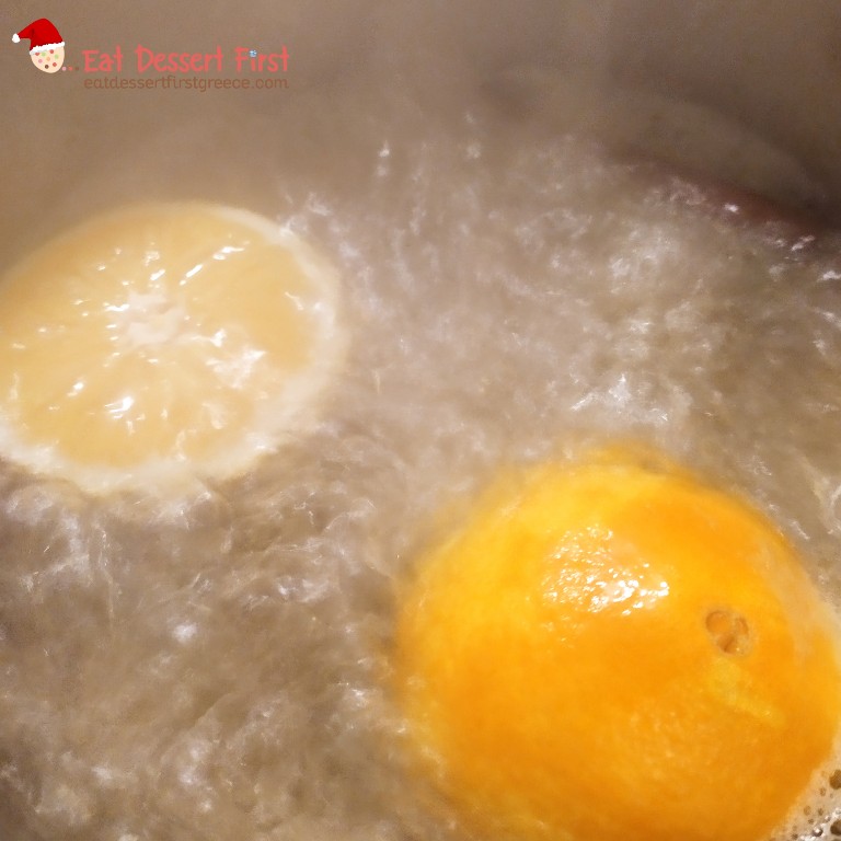 Ξεκινάμε ετοιμάζοντας το σιρόπι. Σε ένα κατσαρόλακι ρίχνουμε το νερό, τη ζάχαρη, το ξύλο κανέλας και το πορτοκάλι κομμένο στη μέση και φέρνουμε σε βρασμό. Βράζουμε για 3 λεπτά (από όταν έχει ξεκινήσει να βράζει το σιρόπι) και αποσύρουμε από το μάτι. Τότε προσθέτουμε το μέλι, για να μην χάσει τα θρεπτικά του συστατικά και το εκχύλισμα πικραμύγδαλου.
