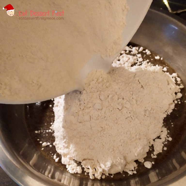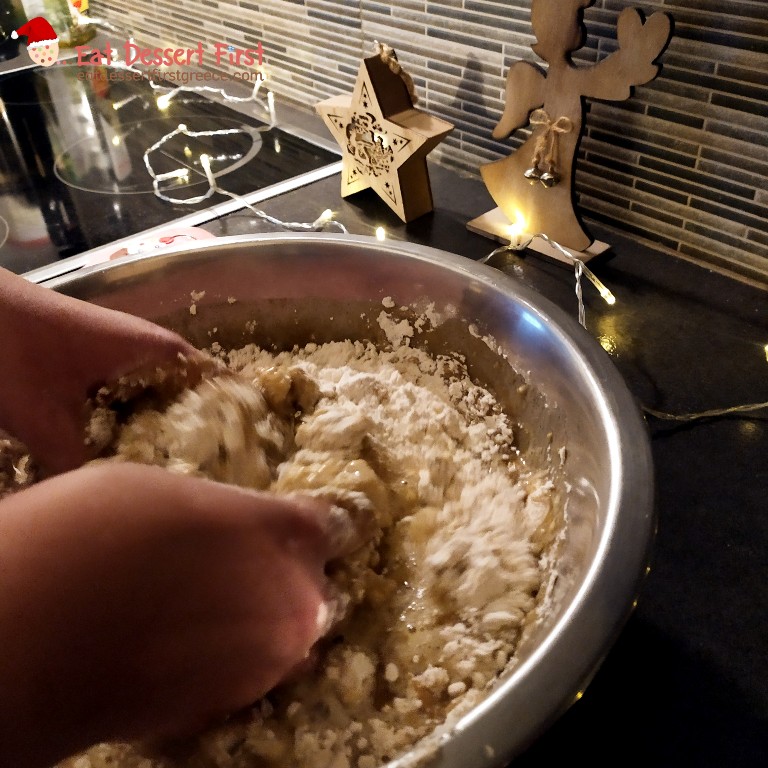 Έπειτα προσθέτουμε το αλεύρι όλο μαζί και ζυμώνουμε ελαφρώς με το χέρι (το αλεύρι δε χρειάζεται κοσκίνισμα). Δε θέλουμε να τα παραζυμώσουμε για να μη βγάλουν το λάδι και μας βγουν πολύ σκληρά. Αφήνουμε τη ζύμη σκεπασμένη για 20 λεπτά να ξεκουραστεί. Η ζύμη πρέπει να έχει την υφή μαλακής πλαστελίνης.