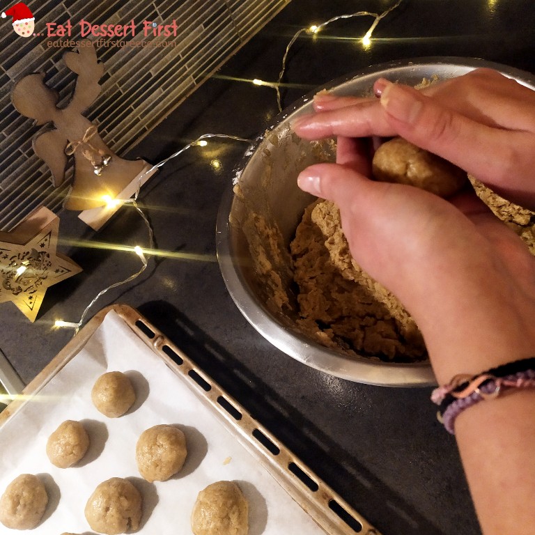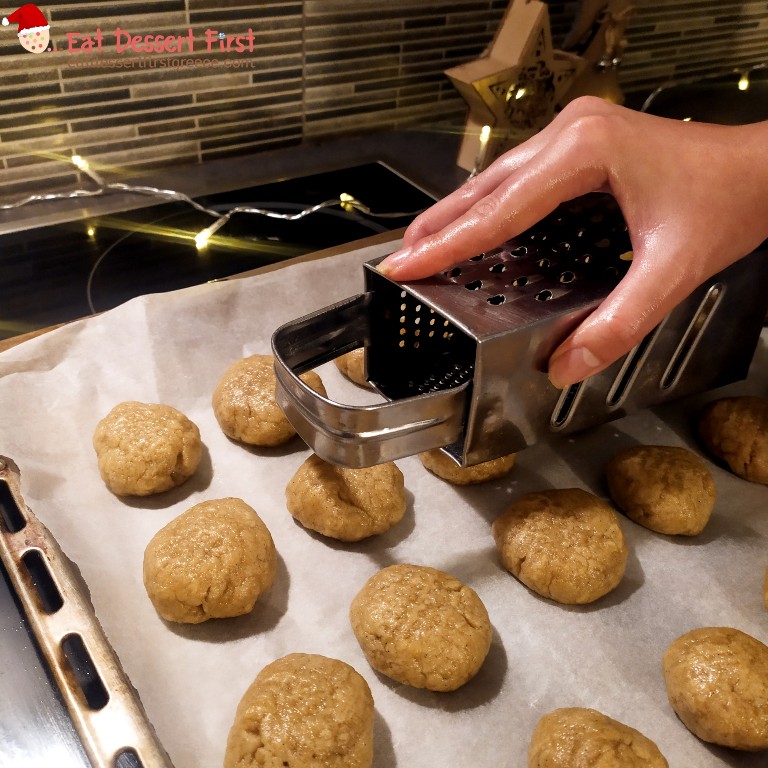 Πλάθουμε τη ζύμη σε μακρόστενους κυλίνδρους και την πατάμε στο κέντρο για να πάρουν το γνωστό σχήμα. Εμείς φέτος τα κάναμε στρογγυλά, πλάθοντας μπαλάκια και πιέζοντάς τα με τον τρίφτη. Μπορούμε να τα πατήσουμε και με ένα πιρούνι και να κάνουμε σχέδιο στην επιφάνεια. Αυτό θα βοηθήσει τα μελομακάρονα να ρουφήξουν σιρόπι αφού ψηθούν.