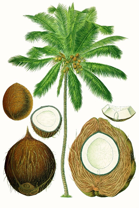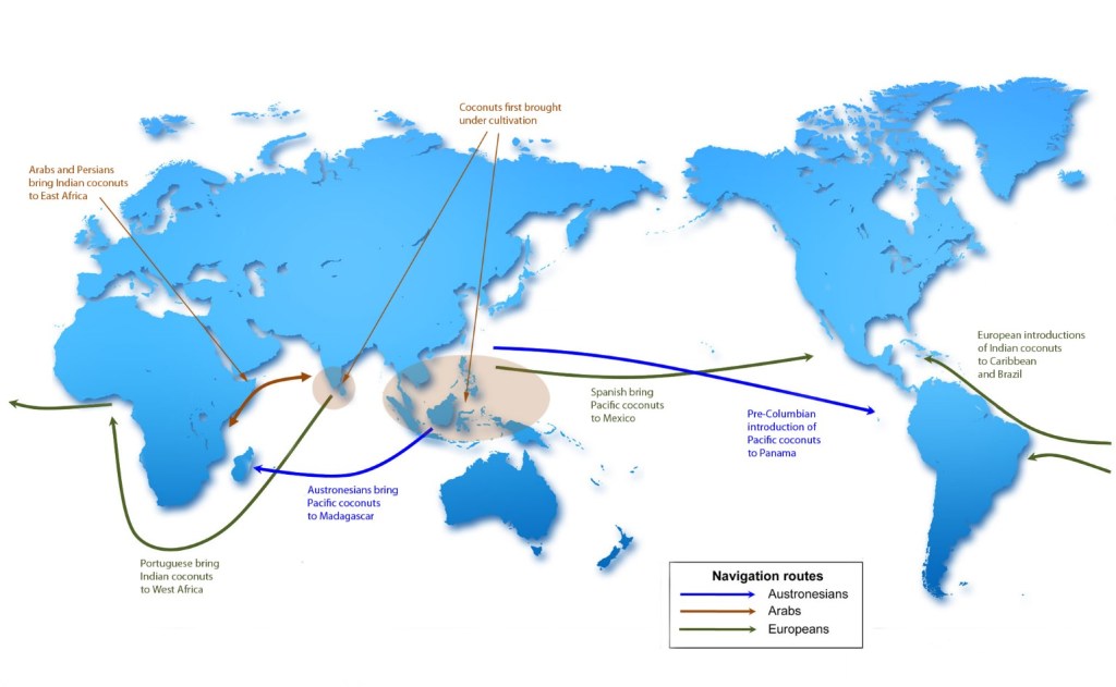 Όσο για την ιστορία της καρύδας, αυτή σχετίζεται με υπερπόντια ταξίδια και αποικισμούς, όπως φαίνεται στον παρακάτω χάρτη. Σήμερα οι κοκοφοίνικες μάθαμε πως καλλιεργούνται κυρίως στη νότια Ασία, την Πολυνησία και τη Μαλαισία. Η ονομασία “coconut” βρήκαμε πως πρωτοεμφανίστηκε τον 15ο αι. όταν Πορτογάλοι εξερευνητές βρήκαν την πληθώρα κοκοφοινίκων στις χώρες του Ινδικού Ωκεανού. Τα δέντρα αυτά διαδόθηκαν από την Ινδία στην ανατολική Αφρική και από εκεί οι Ευρωπαίοι εξερευνητές τα πήγαν στη δυτική πλευρά της Αφρικής και από εκεί στην Αμερικάνικη Ήπειρο.