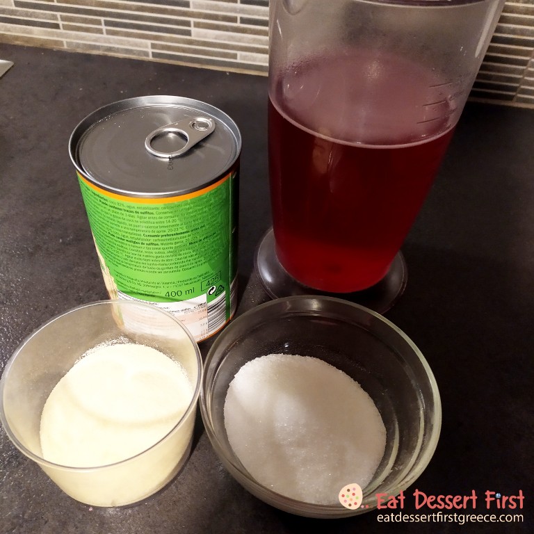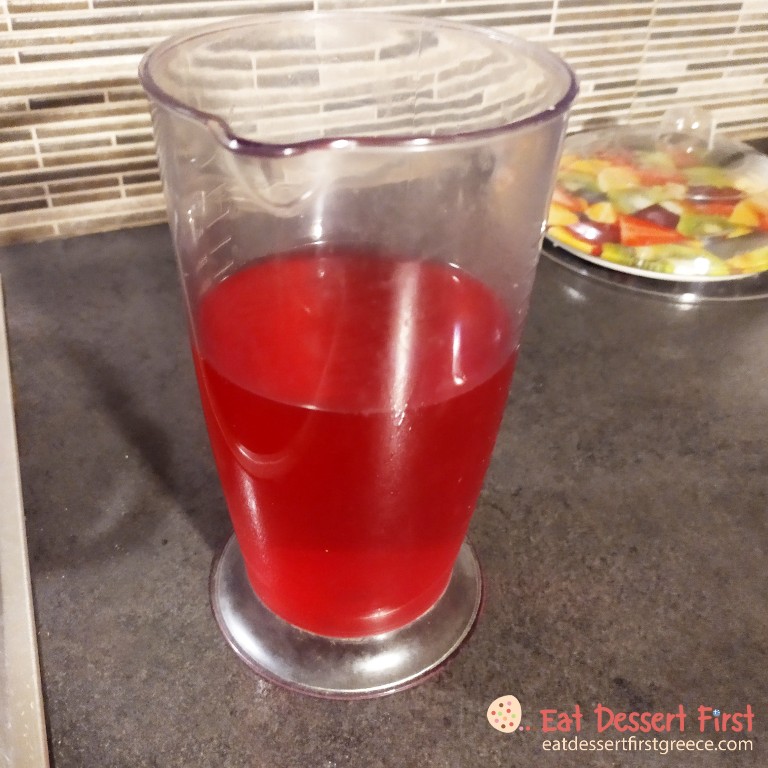 Φτιάχνουμε πρώτα το ζελέ κεράσι ακολουθώντας της οδηγίες στη συσκευασία (εμείς ανακατέψαμε 300 ml βραστό νερό και προσθέσαμε άλλα 300 ml κρύο νερό). Το αφήνουμε στην άκρη για να πέσει η θερμοκρασία του, όχι στο ψυγείο γιατί μπορεί να σταθεροποιηθεί.