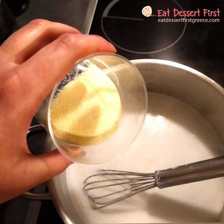 Μόλις αρχίσει να βράζει το γάλα καρύδας, προσθέτουμε τη ζάχαρη και σταδιακά το σιμιγδάλι. Ανακατεύουμε συνεχώς μέχρι να αποκτήσει την υφή κρέμας. Αποσύρουμε και αφήνουμε την κρέμα για λίγο να κρυώσει και γεμίζουμε τα ποτηράκια μας. Έπειτα τα βάζουμε για ένα τέταρτο στο ψυγείο να πήξει η κρέμα κι άλλο. Γενικά, θέλουμε η κρέμα να είναι κρύα και το ζελέ χλιαρό.