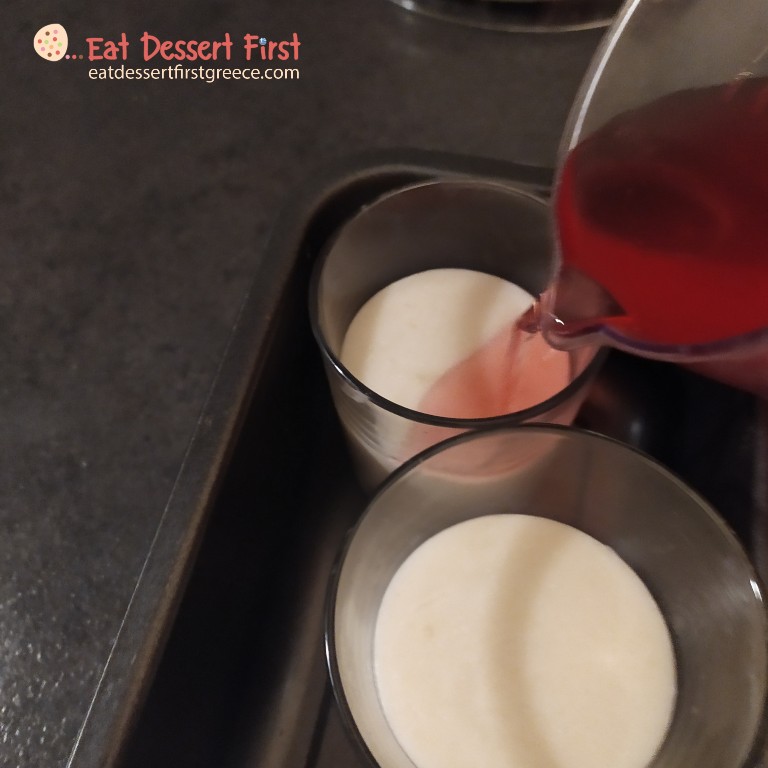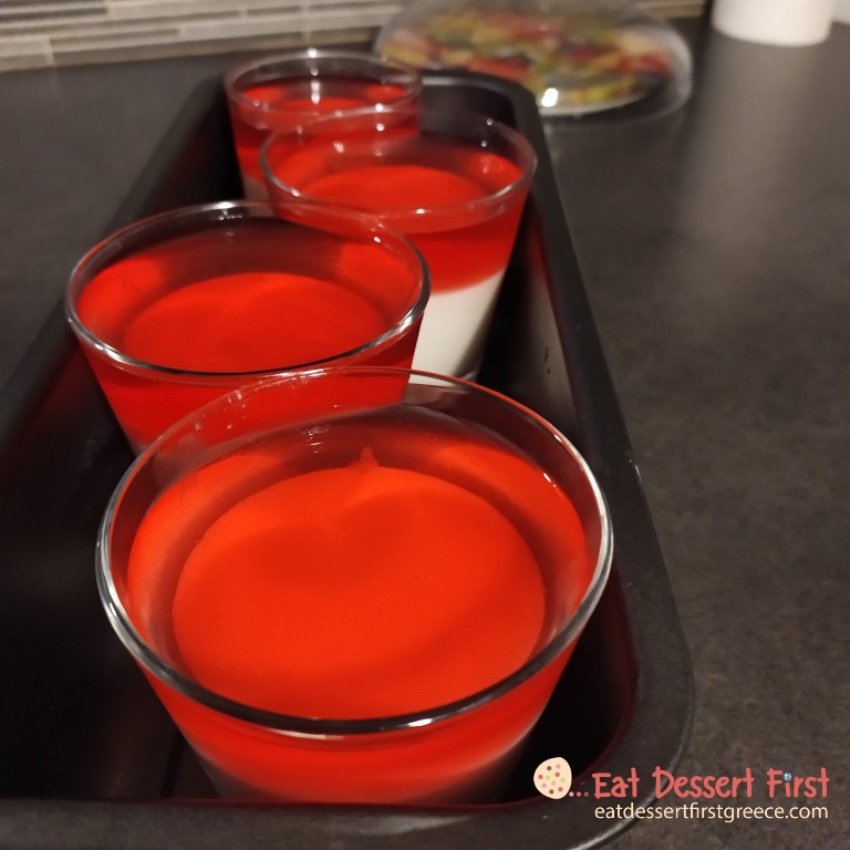 Μόλις κρυώσουν οι κρέμες μας ρίχνουμε από πάνω το ζελέ και βάζουμε τα ποτηράκια μας στο ψυγείο μέχρι να σταθεροποιηθεί το ζελέ.