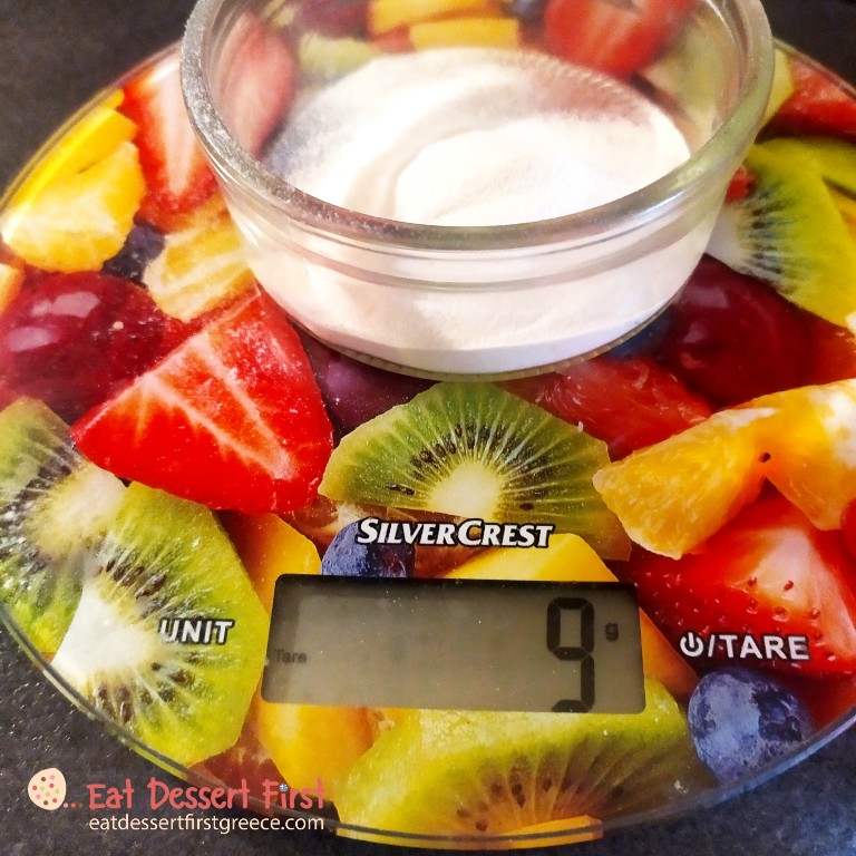 Έπειτα ζυγίζουμε με προσοχή το άγαρ άγαρ, επειδή είναι σημαντικό να βάλουμε τη σωστή ποσότητα για να έχει το γλυκό μας ωραία κρεμώδη υφή.