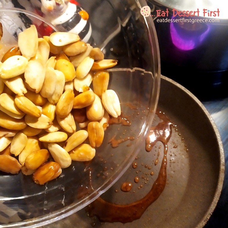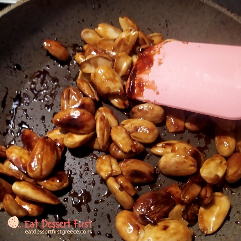 Το πρώτο μας βήμα είναι να φτιάξουμε τα καραμελωμένα αμύγδαλα. Λιώνουμε την καστανή ζάχαρη σε ένα τηγάνι και μόλις πάρει ωραίο καραμελένιο χρώμα ρίχνουμε μέσα τα αμύγδαλα και ανακατεύουμε συνεχώς, μέχρι να καραμελώσουν.