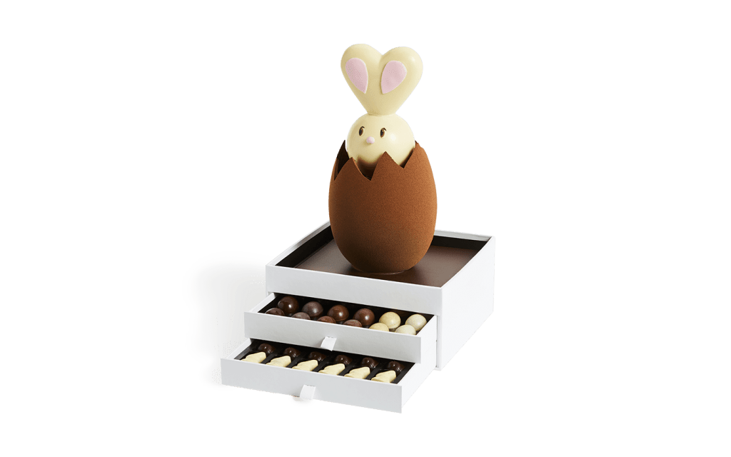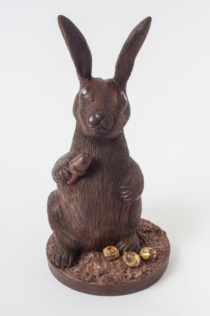 Πασχαλινός λαγός του Pierre Marcolini από το ζαχαροπλαστείο του στις Βρυξέλλες, φωλιασμένος σε ένα χειροποίητο αυγό μαύρης σοκολάτας, που στηρίζεται σε ένα κουτί με 30 μικρά αυγά πραλίνας και ένα κουτί με 30 μικρά ζώα και κουδούνια πραλίνας / καραμέλας. (πηγή)