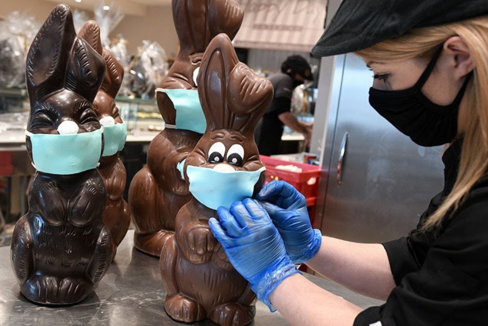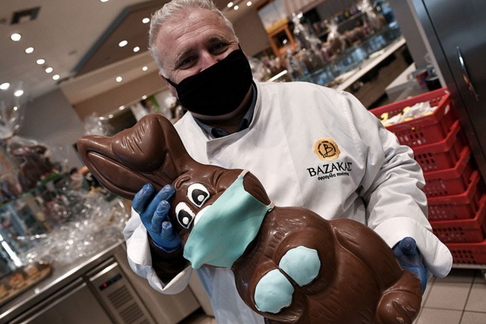 Και στη χώρα μας, ζαχαροπλαστείο στη Λυκόβρυση Αττικής φτιάχνει πασχαλινούς λαγούς της εποχής του Κορονοϊού, με μάσκες και γάντια! (πηγή)