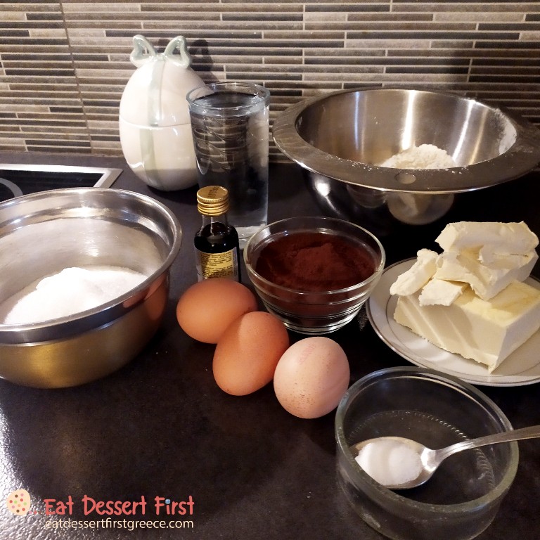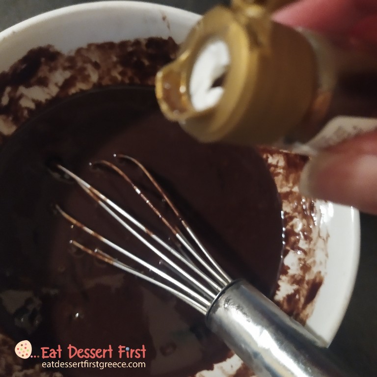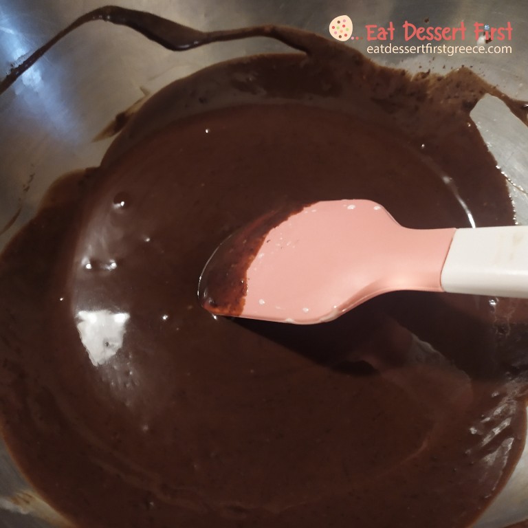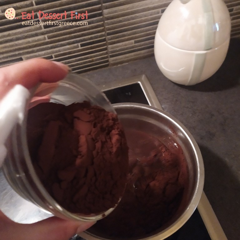 Όσο περιμένουμε να κρυώσει η γκανάζ ετοιμάζουμε το κέικ σοκολάτας. Σύμφωνα με τις οδηγίες της Rose Levy Beranbaum, σε ένα μπολ ανακατεύουμε το κακάο με το βραστό νερό μέχρι να ομογενοποιηθεί το μείγμα. Το αφήνουμε να έρθει σε θερμοκρασία δωματίου.