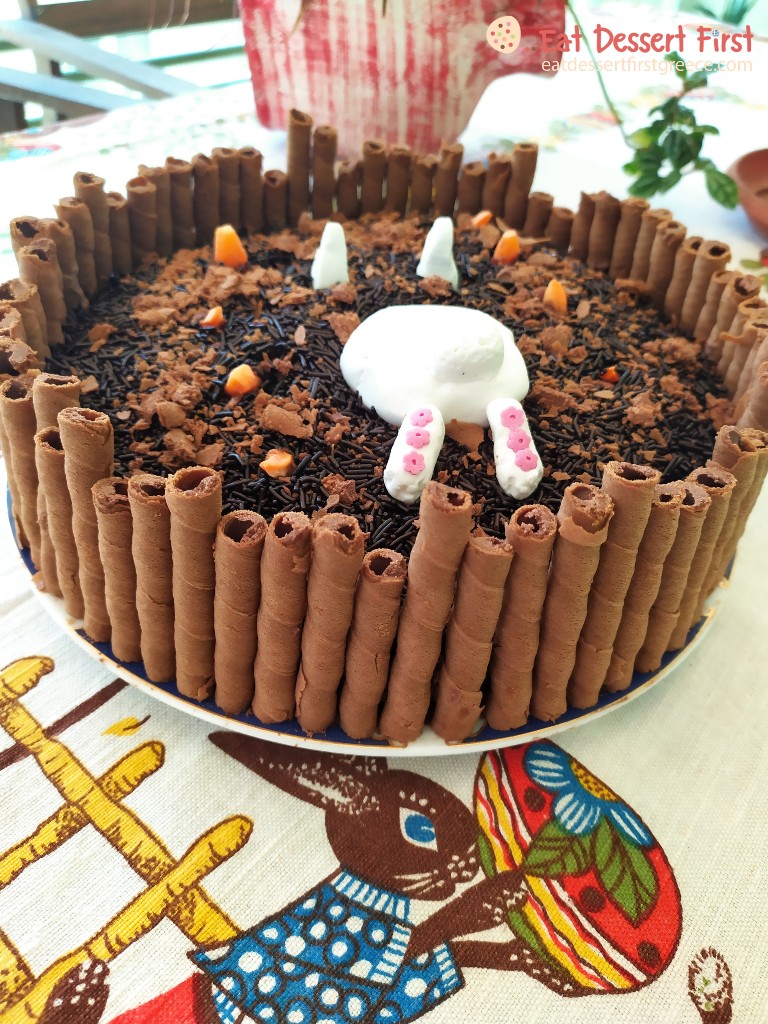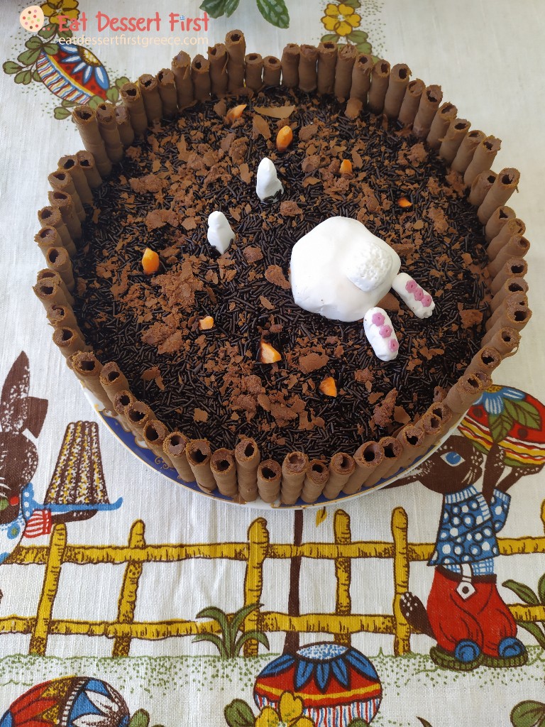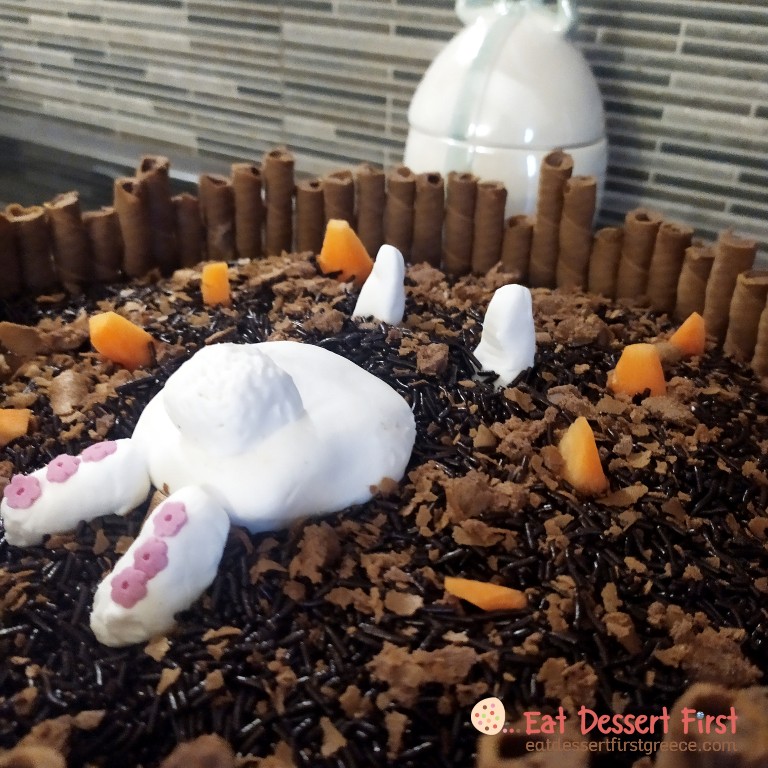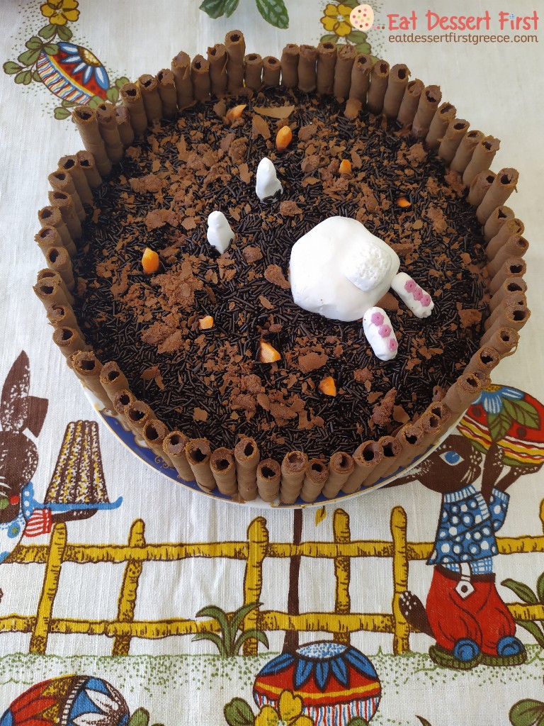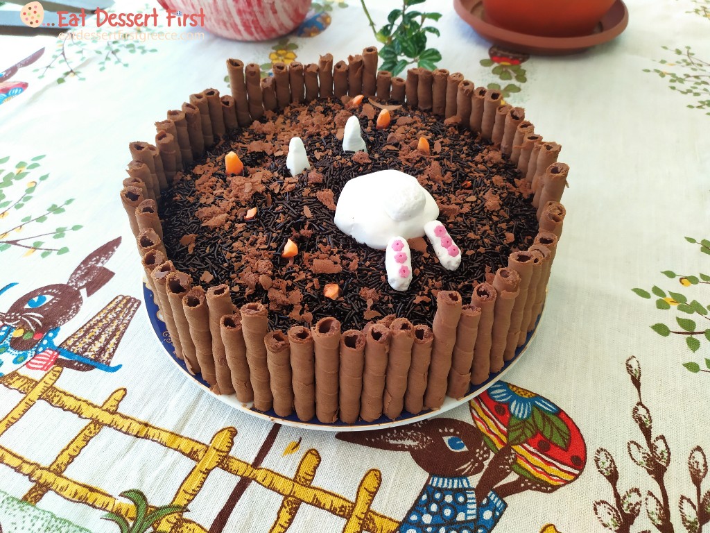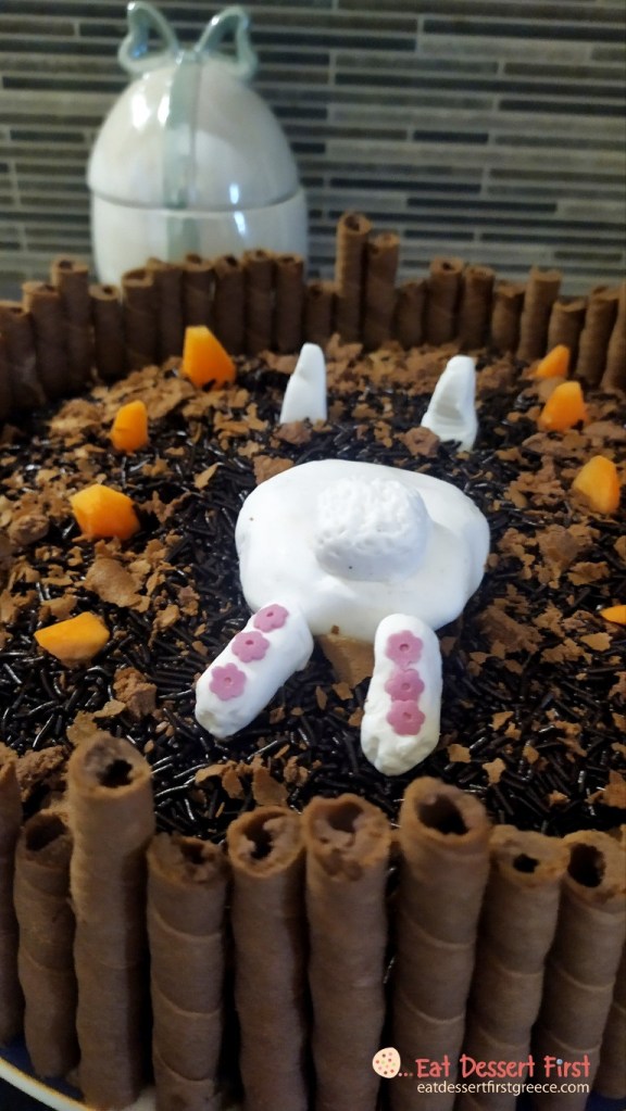 Έχοντας μελετήσει τον πασχαλινό λαγό, ήρθε η ώρα να φτιάξουμε τον δικό μας, που σκάβει την επιφάνεια μιας τούρτας φτιαγμένης με κέικ σοκολάτας και αφρατεμένη γκανάζ σοκολάτας (ganache montée), με πουράκια για φράχτη.