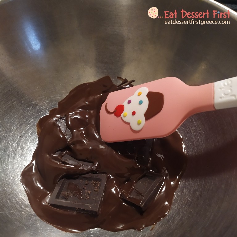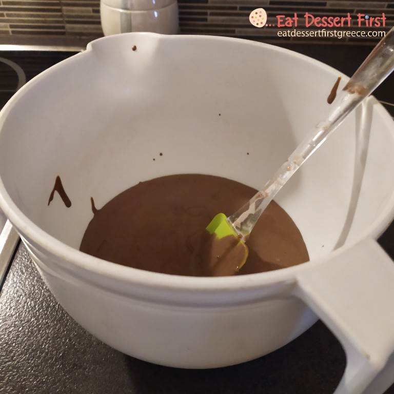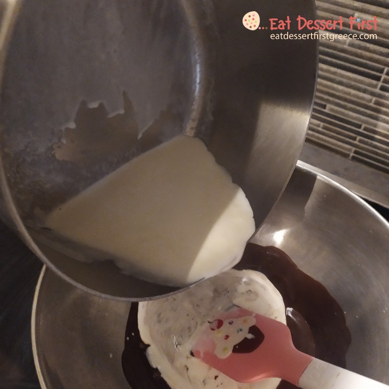 Ξεκινάμε με την αφρατεμένη γκανάζ, μιας και θα χρειαστεί κάποιες ώρες στο ψυγείο. Λιώνουμε την κουβερτούρα σε ένα μπεν μαρί και ζεσταίνουμε τη μισή κρέμα γάλακτος (150 γρ.). Μόλις αρχίσει να βράζει, προσθέτουμε τη ζεστή κρέμα γάλακτος στη λιωμένη κουβερτούρα σε τρεις δόσεις και ανακατεύουμε συνεχώς με μια σπάτουλα ζαχαροπλαστικής.
