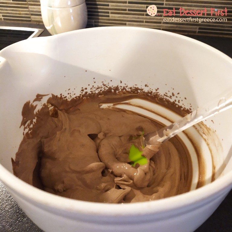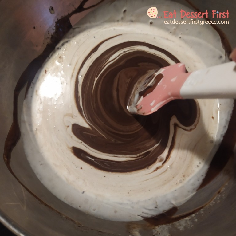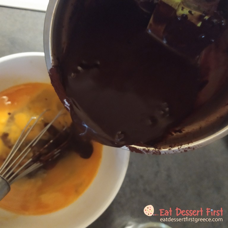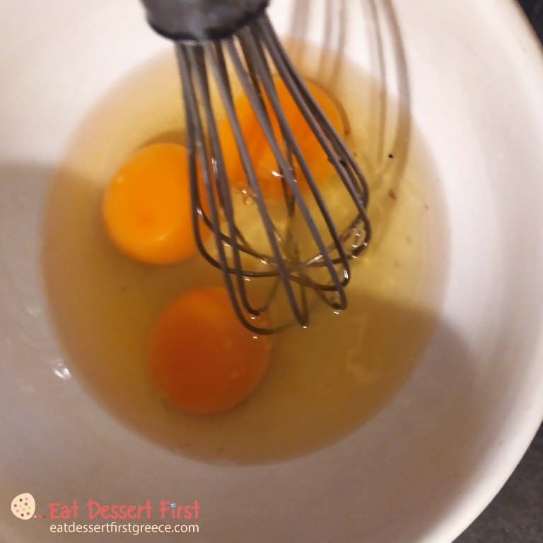 Σε ένα άλλο μπολ χτυπάμε ελαφρά τα αυγά και προσθέτουμε το ¼ του μείγματος με το κακάο και τη βανίλια.