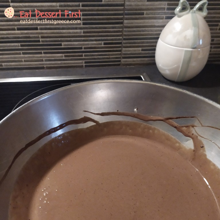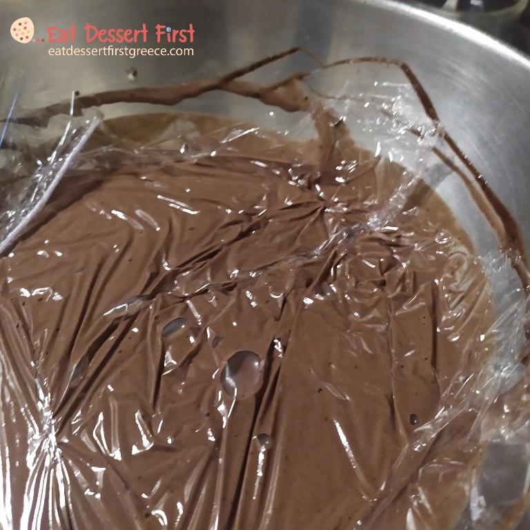 Έπειτα προσθέτουμε την υπόλοιπη μισή, κρύα κρέμα γάλακτος ανακατεύοντας συνεχώς. Ρίχνουμε το μείγμα σε ένα ταψάκι και σκεπάζουμε την επιφάνεια με μια εφαπτόμενη μεμβράνη. Βάζουμε το μείγμα για 5 ώρες τουλάχιστον στο ψυγείο ή ακόμα καλύτερα όλη τη νύχτα.