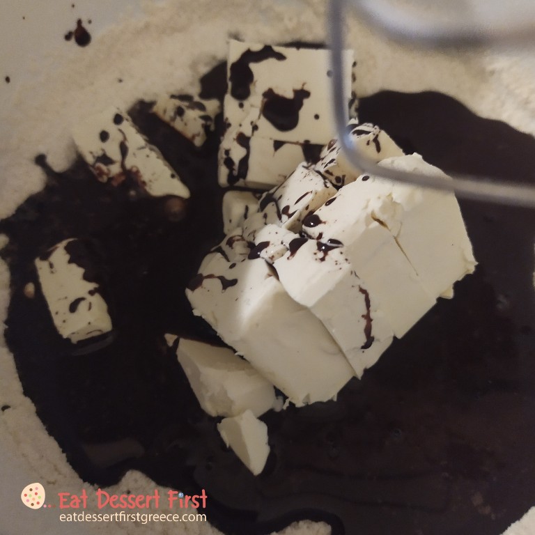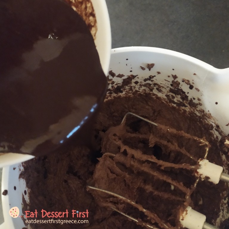 Ρίχνουμε τα στερεά συστατικά στον κάδο του μίξερ και τα χτυπάμε για 30 δευτερόλεπτα. Προσθέτουμε το βούτυρο και το υπόλοιπο μείγμα με το κακάο. Χτυπάμε με το μίξερ αρχικά στο χαμηλό μέχρι να βραχούν τα στερεά συστατικά. Έπειτα ανεβάζουμε στο υψηλό και χτυπάμε για 1½ λεπτό για να πάρει αέρα το μείγμα και να δημιουργηθεί η δομή του κέικ. Προσθέτουμε τα αυγά σε 3 δόσεις, χτυπώντας για 20 δευτερόλεπτα κάθε φορά για να ενσωματωθούν τα υλικά και να σταθεροποιηθεί η δομή του κέικ.