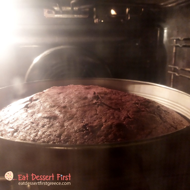 Λαδώνουμε τη φόρμα ή το τσέρκι μας και γεμίζουμε μέχρι τη μέση. Ψήνουμε σε προθερμασμένο φούρνο στους 175°C για 45-50 λεπτά. Βγάζουμε το κέικ και μόλις κρυώσει λίγο το αναποδογυρίζουμε σε ένα μεγάλο πιάτο και τοποθετούμε κάτι βαρύ από πάνω για να ισιώσει το κέικ μας.