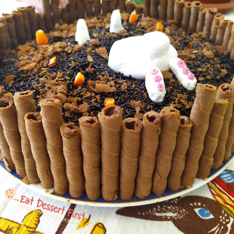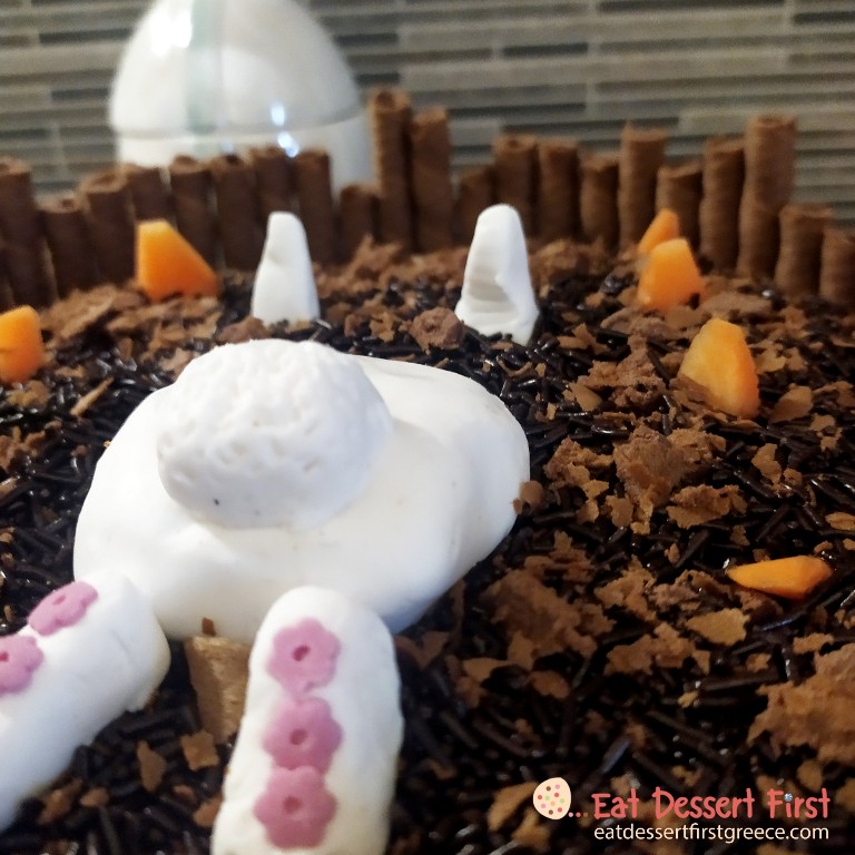 Απλώνουμε την αφρατεμένη γκανάζ στην πάνω πλευρά του κέικ και στα πλάγια. Εκεί θα κολλήσουμε σπασμένα στη μέση πουράκια για να φτιάξουμε τον φράχτη. Έπειτα γεμίζουμε την επιφάνεια με τρούφα υγείας και ένα τριμμένο πουράκι για να μοιάζει με χώμα. Φτιάχνουμε τον λαγό με ζαχαρόπαστα και κόβουμε μικρά καροτάκια από ένα φρέσκο καρότο. Τώρα θαυμάζουμε τη δημιουργία μας, μιας και είναι και πανέμορφη και πεντανόστιμη.
