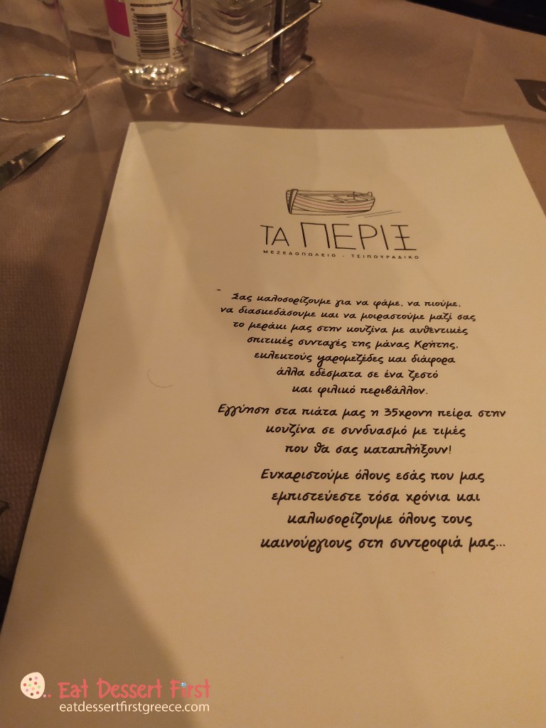 Στο Eat Dessert First Greece, εκτός από τα γλυκά, μας αρέσει και το καλό φαγητό, ειδικά όταν συνοδεύεται από μια ενδιαφέρουσα ιστορία. Μια τέτοια περίπτωση είναι Τα Πέριξ, ένα μεζεδοπωλείο στο Περιστέρι, στην οδό Μεγάλου Αλεξάνδρου 27. Είναι από τα μέρη που επισκεπτόμαστε συχνά, τόσο για το καλό του φαγητό, όσο και για το πανέμορφο περιβάλλον του, σπιτικό μέσα και δροσερό στην αυλή, με σκιά από μεγάλες μουριές. Ένα όμορφο βραδάκι φάγαμε εκεί τα μεζεδάκια μας και συζητήσαμε με τον ιδιοκτήτη, τον Κρητικό κ. Νίκο Φαλιακάκη.