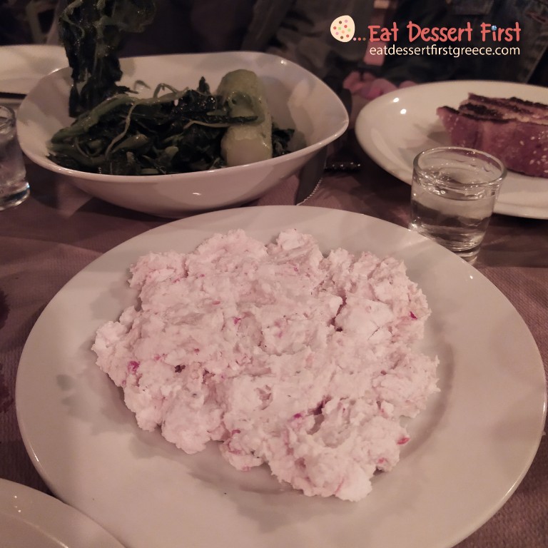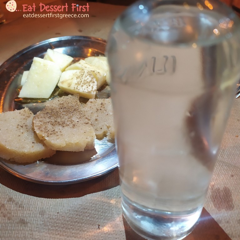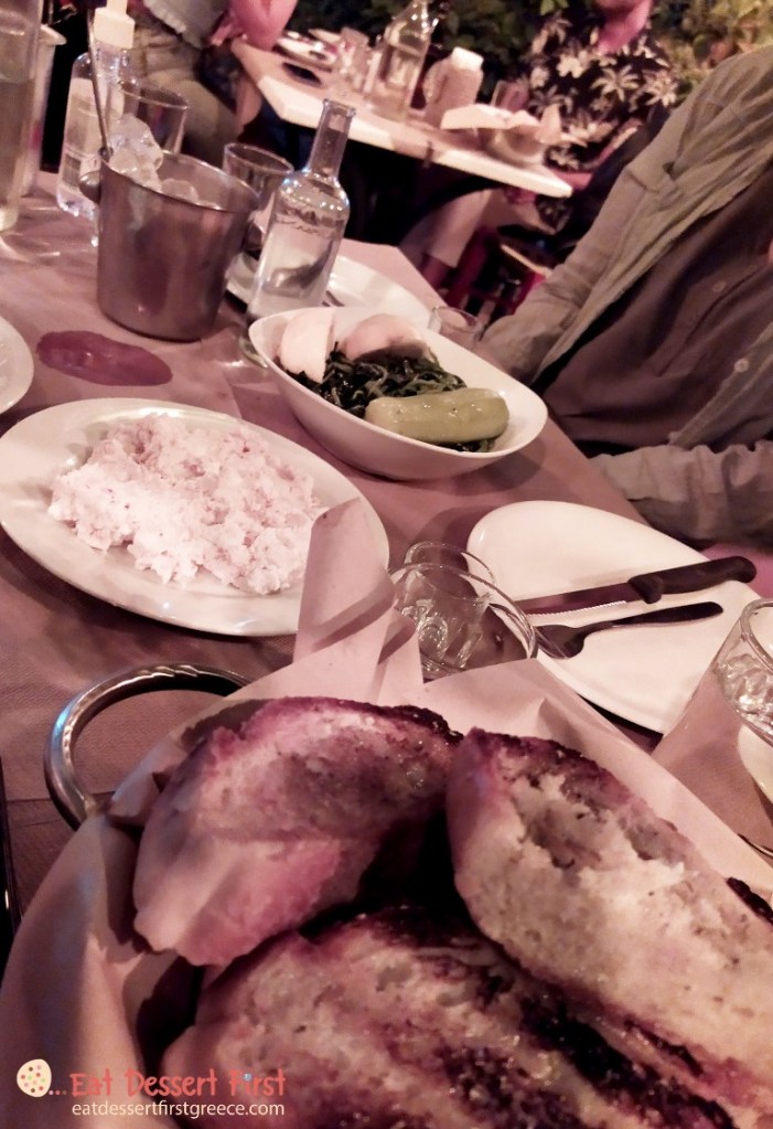 Ξεκινήσαμε το γεύμα μας με ψωμάκι ψημένο με λαδορίγανη, χειροποίητη τυροκαυτερή και νόστιμα και υγιεινά φρέσκα χόρτα. Ήπιαμε φυσικά ρακή και λευκό κρασάκι.