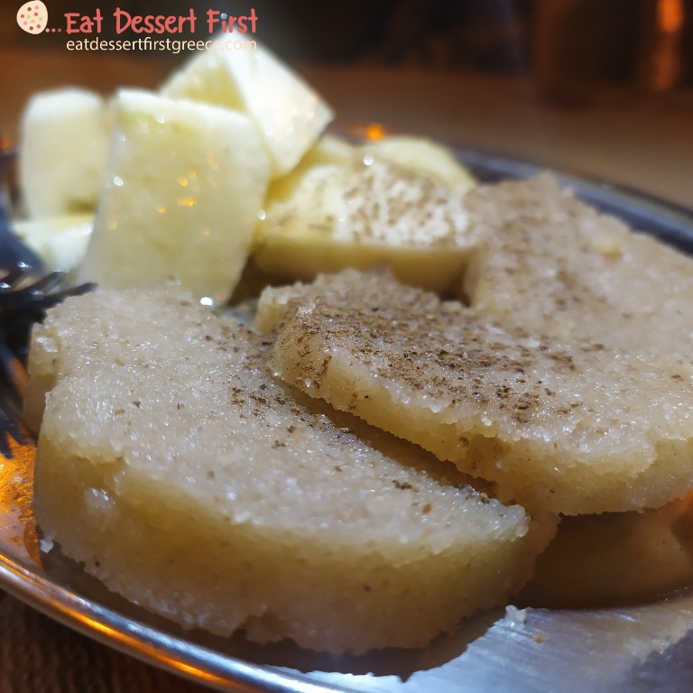 Στο τέλος, για κέρασμα, άλλη μια ρακή, χειροποίητος σιμιγδαλένιος χαλβάς και φρέσκο μήλο με μέλι και κανέλα!