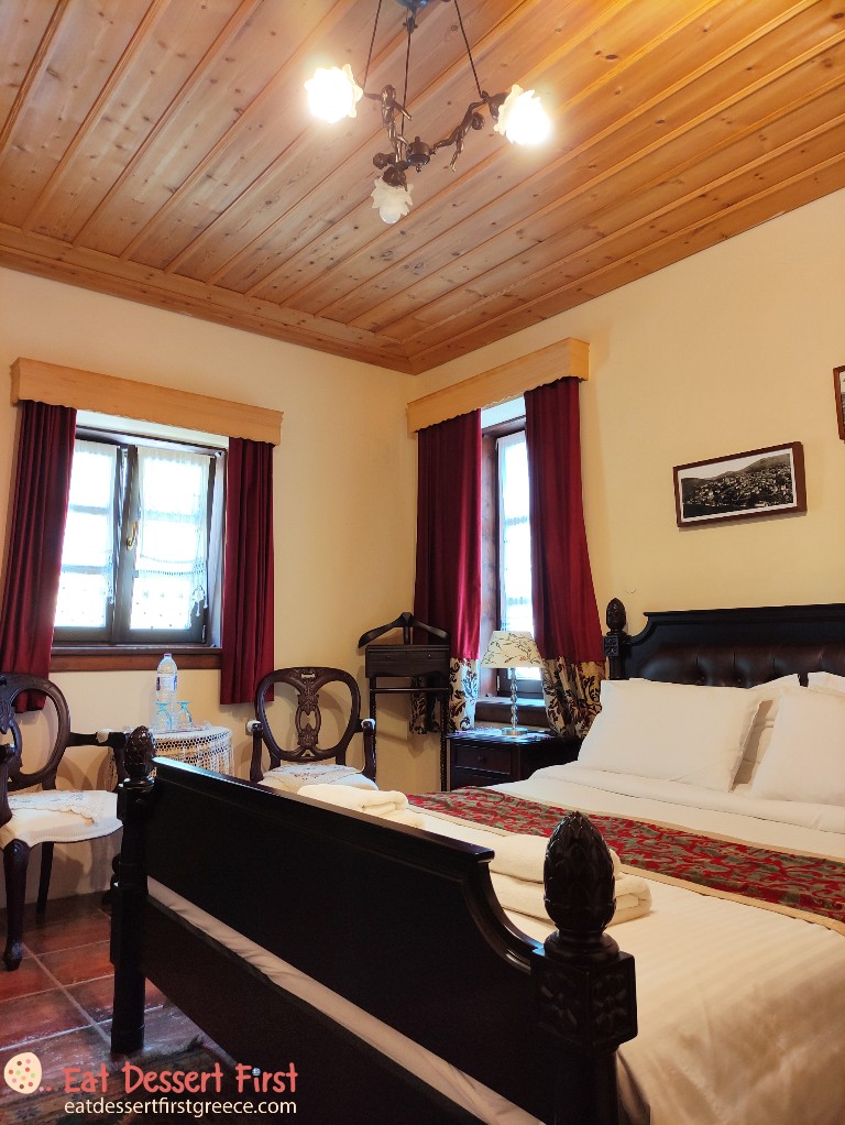 After our nice conversation and the enjoyable coffee with the wonderful view of the yard we went up to rest in our room. The room, like the whole guesthouse, was decorated in a neoclassical style, which, as we were told, characterizes the mansions of Nymfaio. The view from the windows was very beautiful and the bed incredibly soft and fragrant; everything you need for a relaxing, restful sleep.