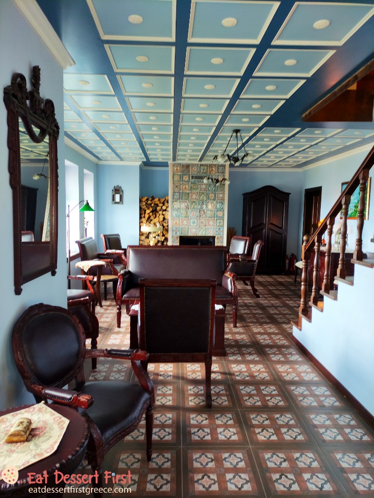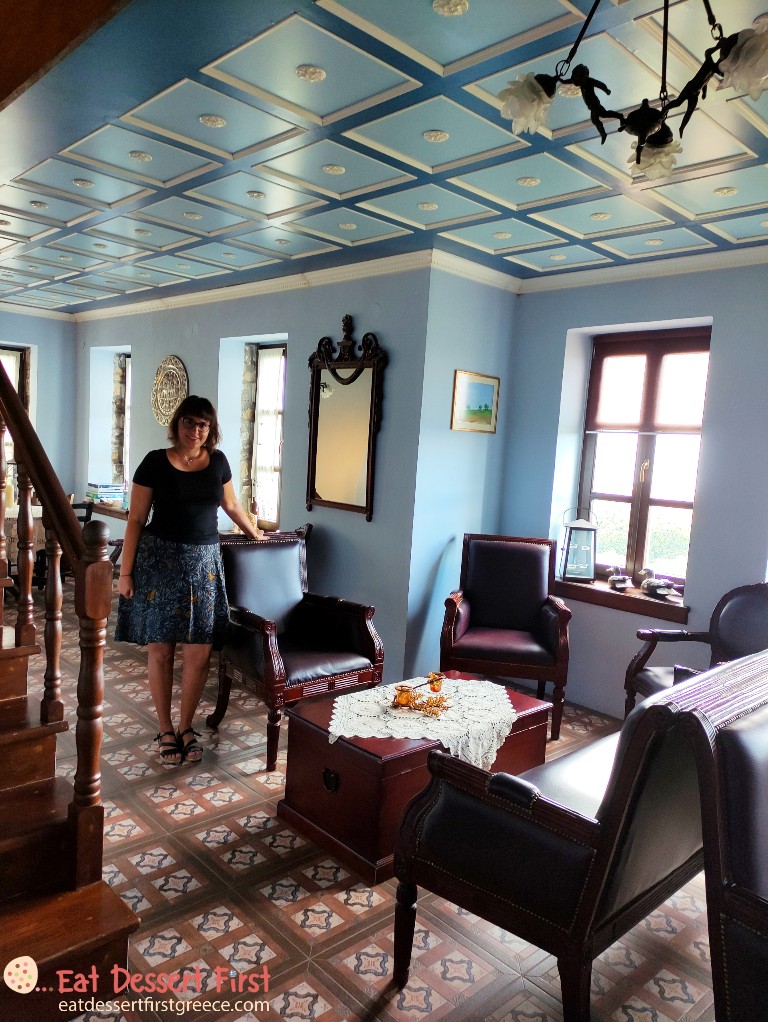 Returning to the Argyro Guesthouse, we went up to the room for a while to rest and get ready for the night out for lunch at the famous and award-winning Taverna Thomas. We got dressed and before we left we enjoyed for a while the beautiful, decorated in shades of blue, living room of our floor, and we took our photos too!