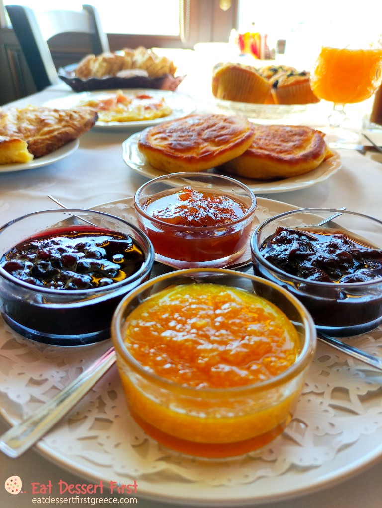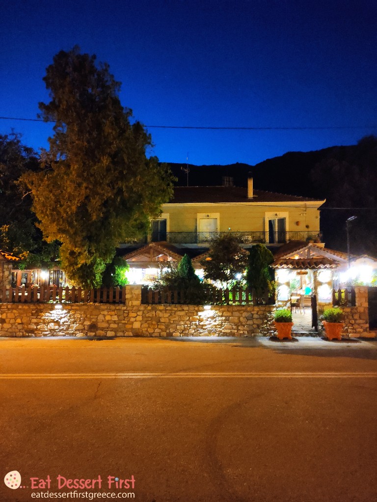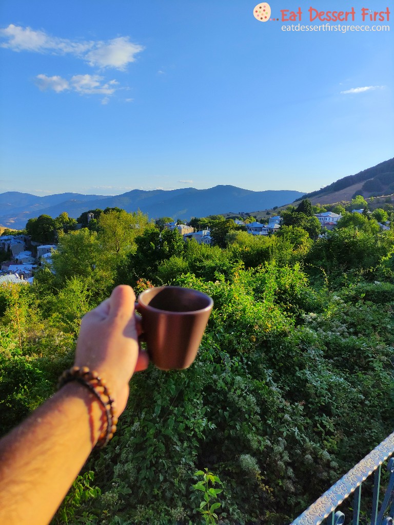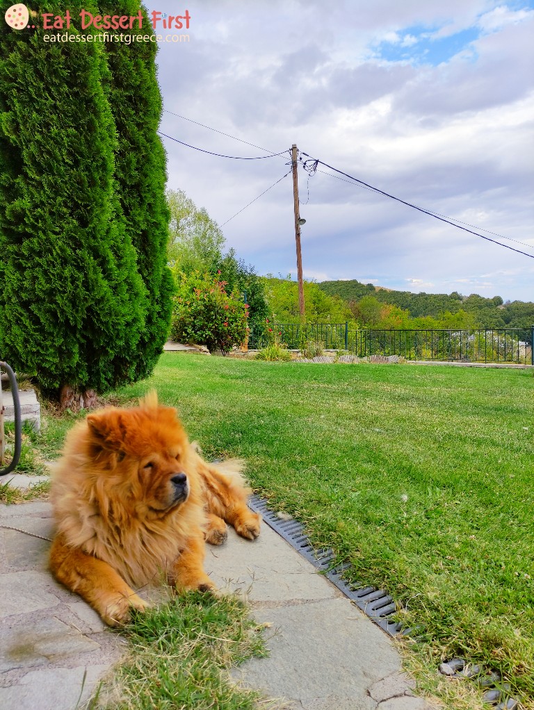 The owners Ioannis Iatridis and his wife Argyro Felesaki welcomed us warmly and invited us to sit with them in the courtyard of the guesthouse. The view enchanted us instantly! Especially when we enjoyed it with Greek coffee, cookies and handmade quince spoon sweet which Mrs. Argyro offered us. We immediately met the animals of the hostel, two sweet Chow Chow!