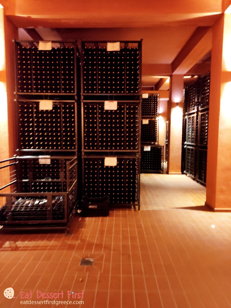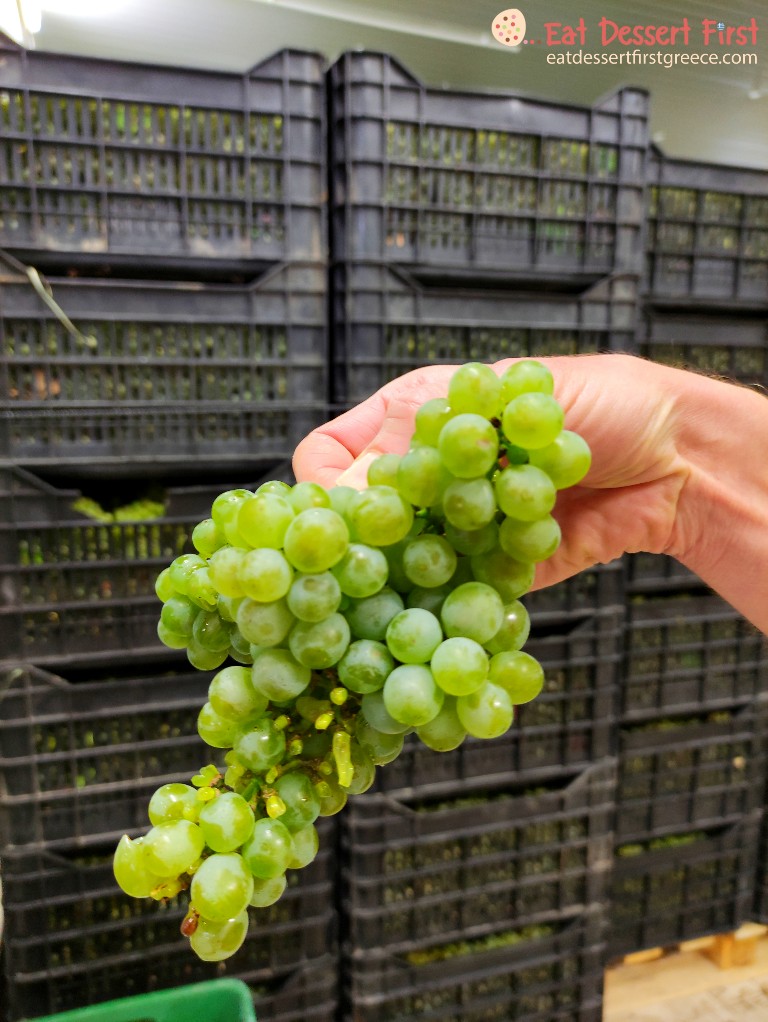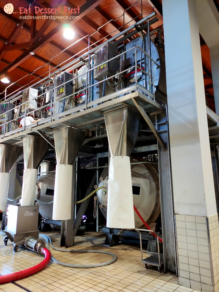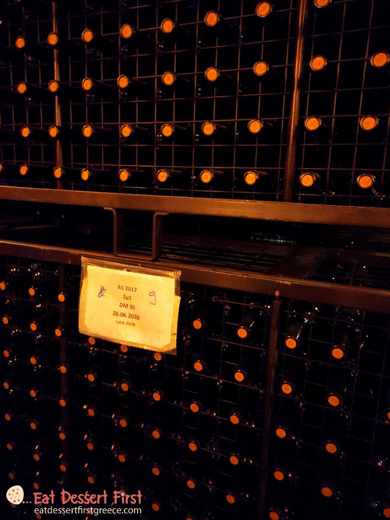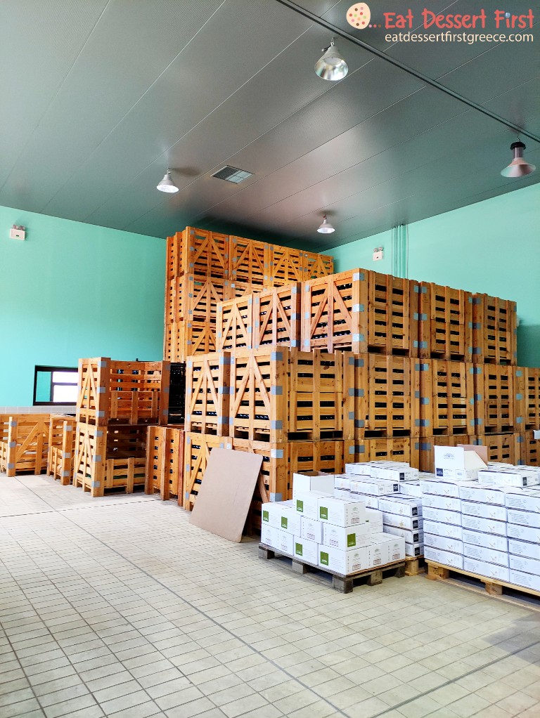 Then Mrs. Meditskou showed us the refrigerators, two large chambers, where the grapes are stored at a temperature of 4-5°C, a cold temperature. The grapes after the harvest are not left to rot in the sun, but are stored in the refrigerators until the next morning, when the process of destemming that separates the berries from the stalks will begin. The rest of the year, except for the harvest, the refrigerators serve as storage areas for the finished products.