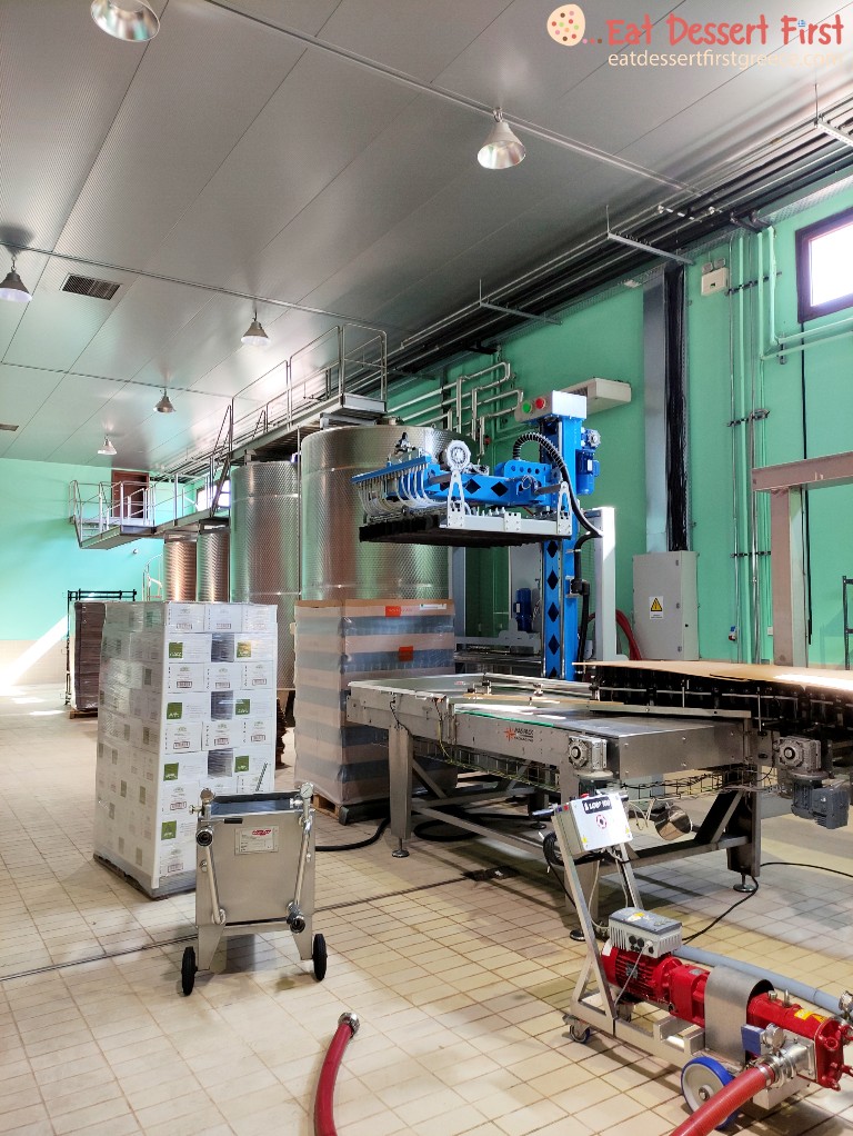 Returning to the ground floor, Mrs. Meditskou took us to the two complete lines of bottling and labeling. During the harvest season they usually do not have bottling, but labeling to get the wine on the market. In Greece we do not have a developed glass industry, so the bottles are necessarily supplied from abroad; the labels and the cardboard boxes, however, they make sure that they are supplied by Greek companies.