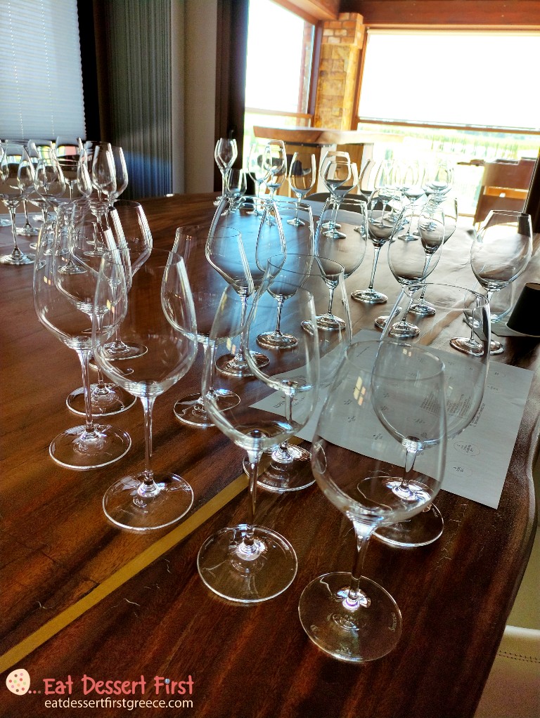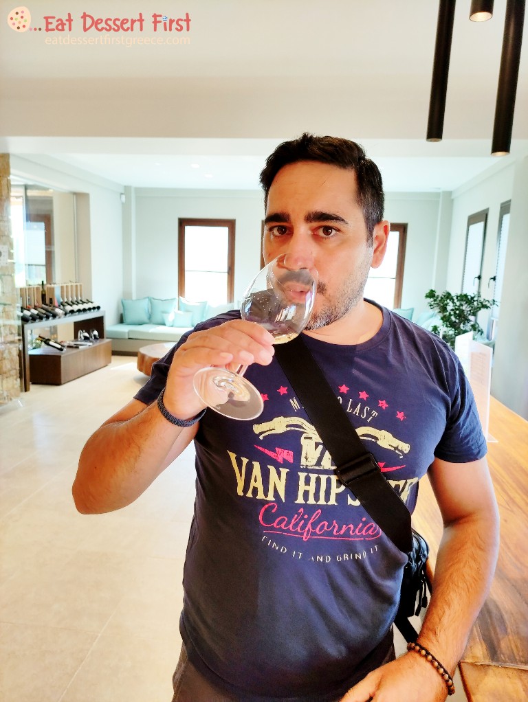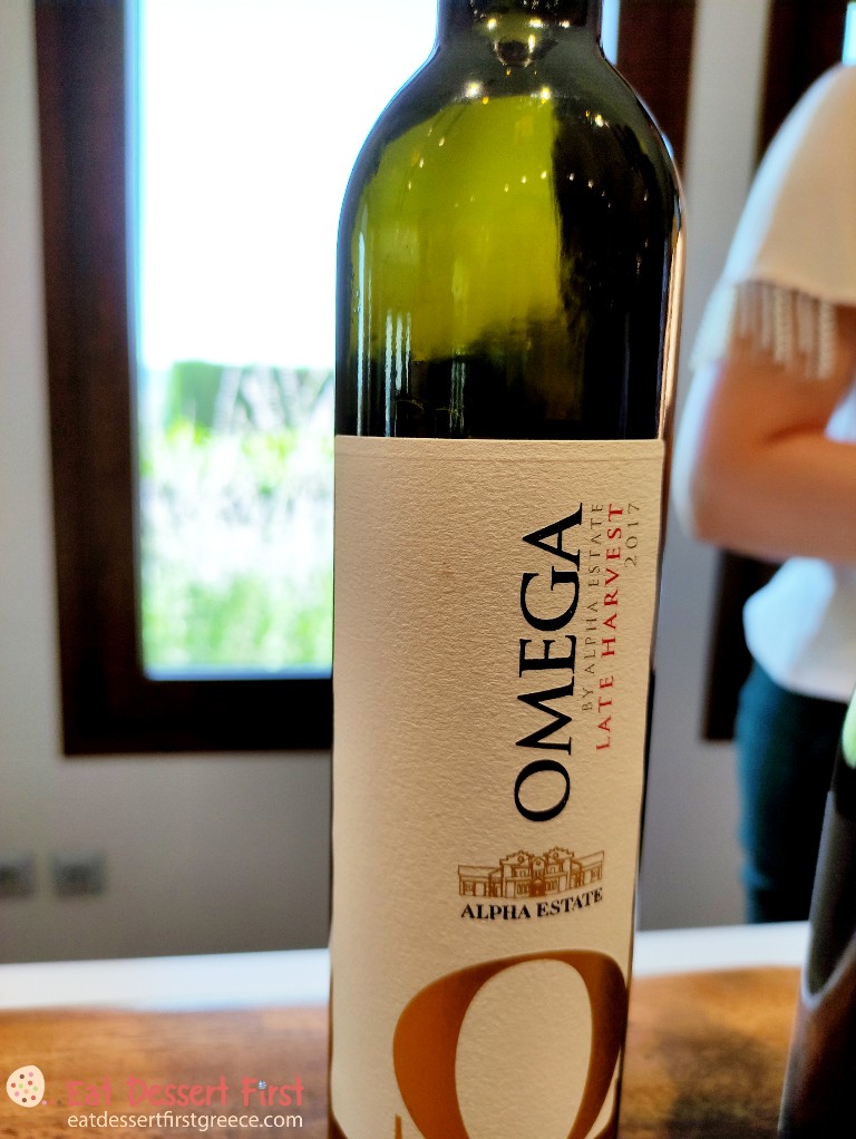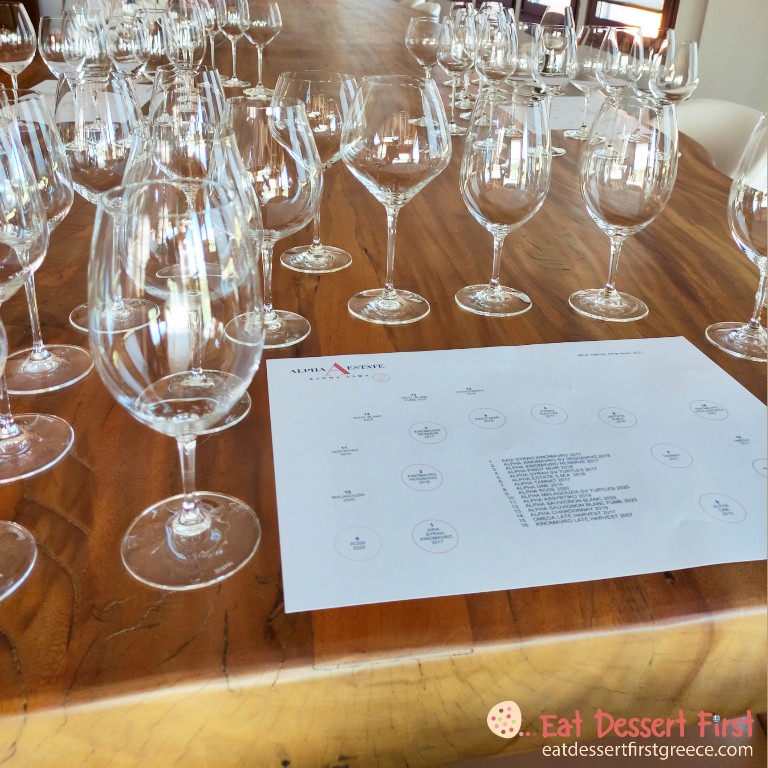 After completing the extremely interesting tour, it was time for the wine tasting. In the testing area we met Mrs. Magda, who served us 7 different types of ALPHA Estate wines, the white Sauvignon Blanc and Chardonnay, their unique Rose of 100% Xinomavro, the red Axia, Xinomavro and Xinomavro Reserve, as well as the white dessert wine Omega, and explained in detail their characteristics and how they are produced. Especially about the Xinomavro Reserve, Mrs. Meditskou had told us that it comes from a dry vineyard of about 100 years, which is irrigated only by the weather conditions and has a very low yield. We felt very lucky to try it!