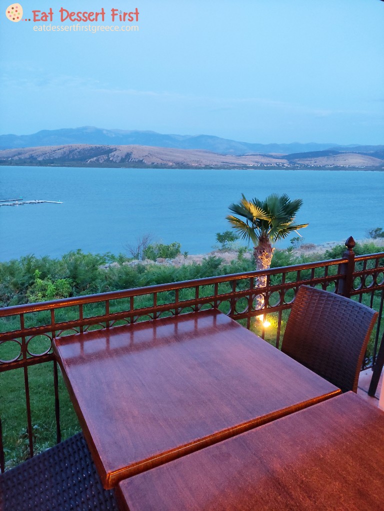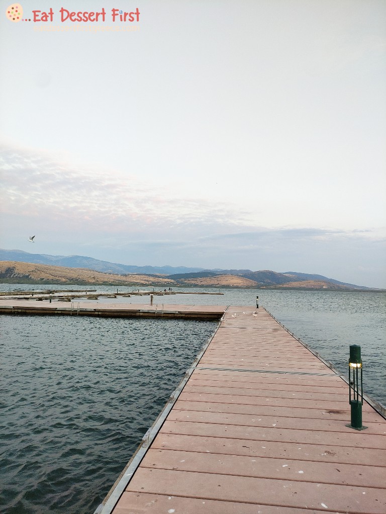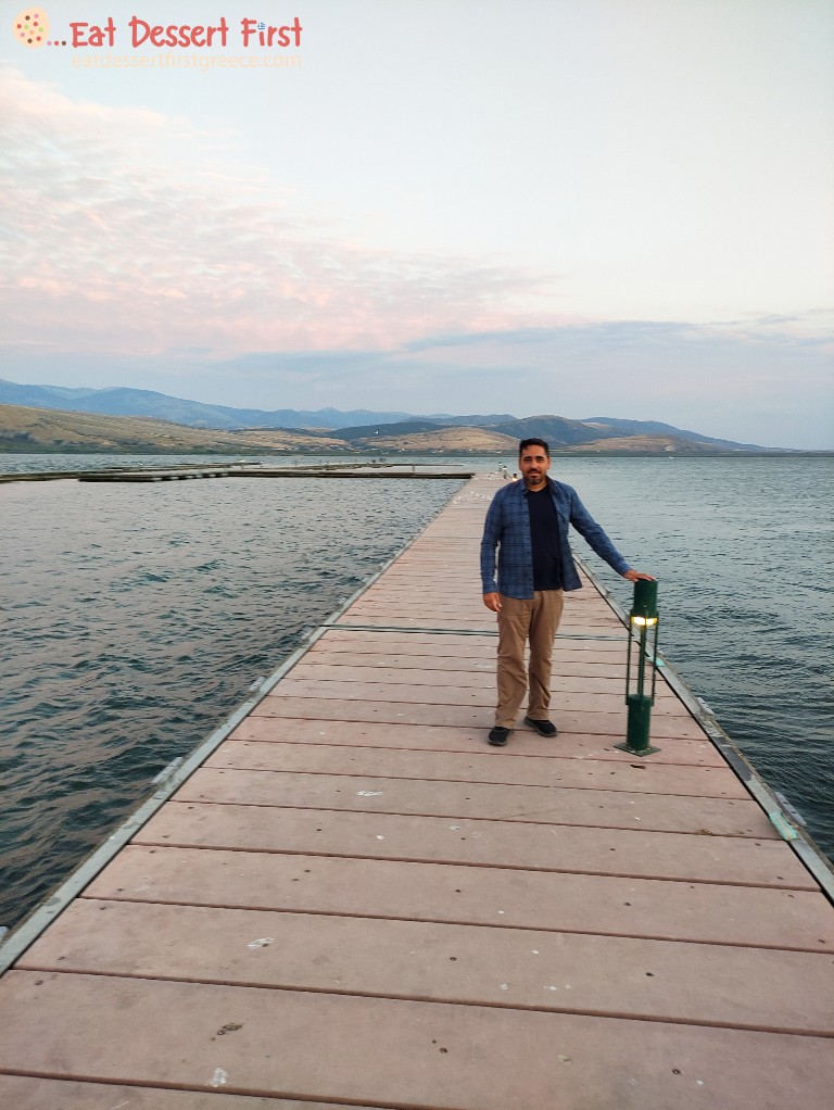 Μετά την απόλυτη χαλάρωση στο ζεστό υδρομασάζ, ανυπομονούσαμε να δοκιμάσουμε τα πιάτα του εστιατορίου Ναουμίδη για τα οποία μας είχε μιλήσει το πρωί ο σεφ του κ. Άγγελος Ναουμίδης. Η κ. Ιωάννα του ξενώνα Μετόχι μας είχε επίσης πει να πάμε στον Άγιο Παντελεήμονα προτού βραδιάσει για να κάνουμε μια βόλτα σε μια όμορφη προβλήτα που έχει κάτω από το εστιατόριο. Οπότε, λίγο πριν σκοτεινιάσει φτάσαμε στο χωριό και είδαμε την μεγάλη προβλήτα. Ήταν πολύ γοητευτική, μέσα στα ταραγμένα νερά της λίμνης -φυσούσε πολύ εκείνη τη μέρα. Ανεβήκαμε και βγάλαμε τις φωτογραφίες μας!