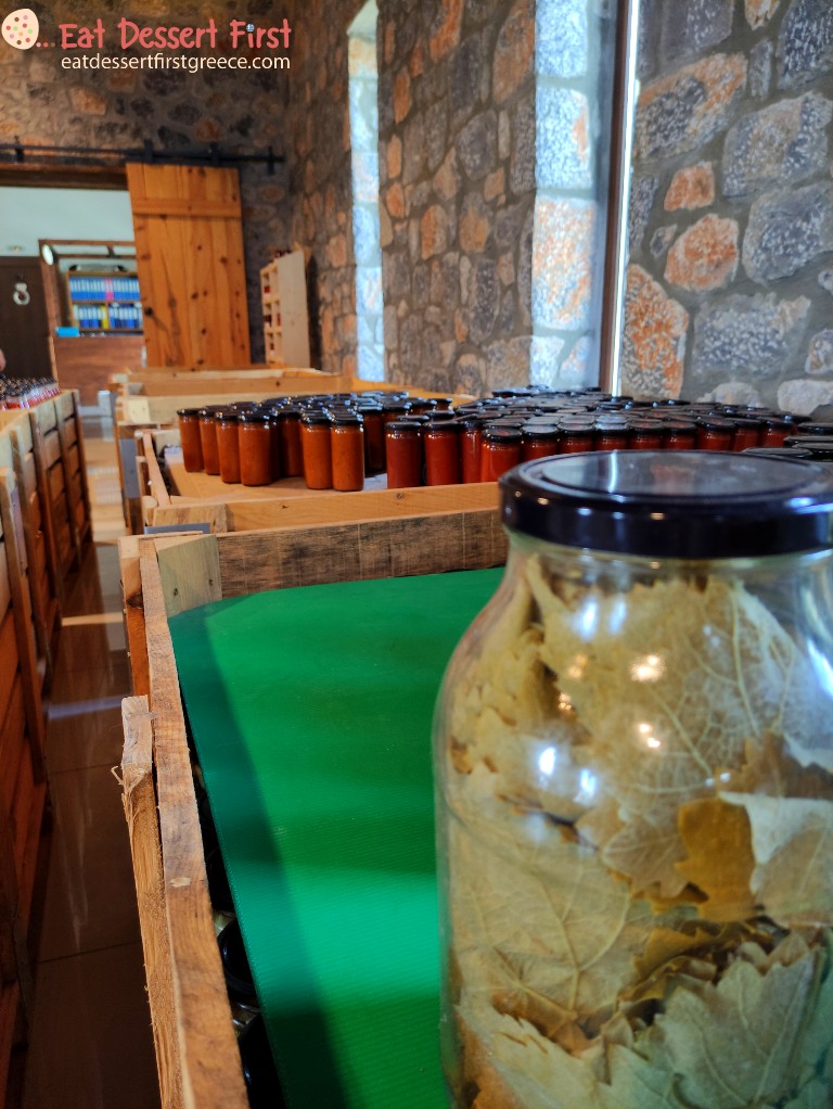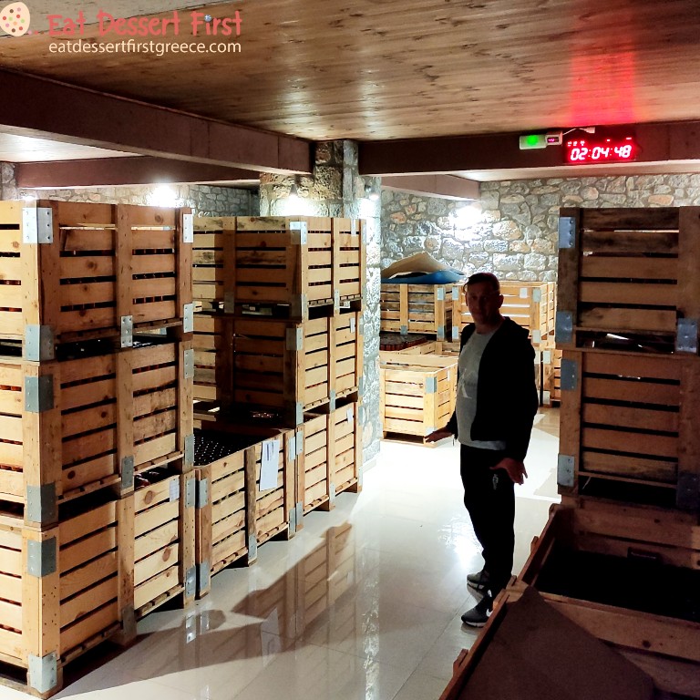 Μετά από την κάθε επεξεργασία, οι πιπεριές πηγαίνουν στην αποθήκη, όπου μπαίνουν οι ετικέτες στα βάζα. Μπαίνοντας μέσα στο κτίριο μας κατέκλυσε μια φανταστική μυρωδιά, η οποία συμπύκνωνε όλα όσα μας είχαν αφηγηθεί. Στη συνέχεια, τα βαζάκια κατεβαίνουν στα δύο κελάρια του κτιρίου, για να ξεκουραστούν· αυτό είναι ένα πολύ σημαντικό στάδιο. Ο στόχος είναι η πιπεριά να βρεθεί όσο πιο γρήγορα γίνεται από το χωράφι στο υπόγειο. Τα ξύλα που χρησιμοποιούνται στην αποθήκη και στο κελάρι είναι όλα ελληνικά, από Μαύρη Πεύκη.