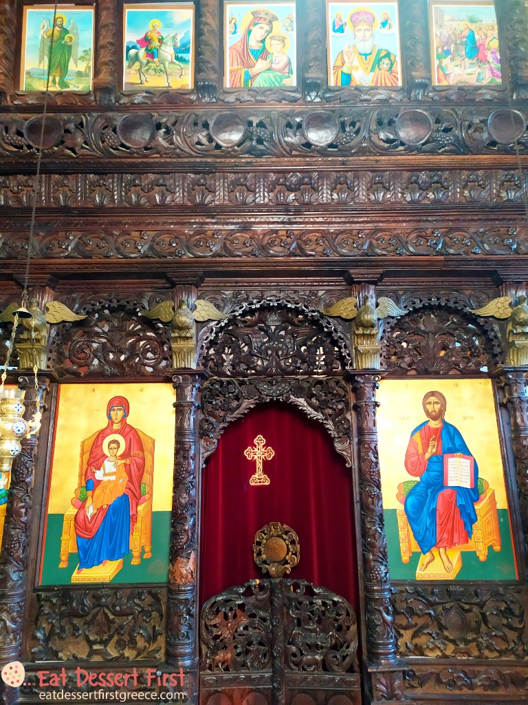 Το στολίδι του ναού είναι αναμφισβήτητα το ξυλόγλυπτο τέμπλο του τέλους του 18ου αι., φτιαγμένο από δύο μάστορες, με τον δεύτερο να συνεχίζει το έργο που άφησε ο πρώτος στη μέση. Η διαφορά φαίνεται από το ότι ο πρώτος μάστορας είχε κάνει πιο βαθιά σκαλίσματα, ενώ ο δεύτερος πιο ρηχά. Αν κοιτάξει κανείς με προσοχή τις λεπτομέρειες του τέμπλου θα εντυπωσιαστεί πραγματικά από την τέχνη και το μεράκι με τα οποία έχει δημιουργηθεί… Οι αγιογραφίες που υπάρχουν σήμερα στο τέμπλο είναι, όπως προσέξαμε κι εμείς νεότερες, της δεκαετίας του 1970.