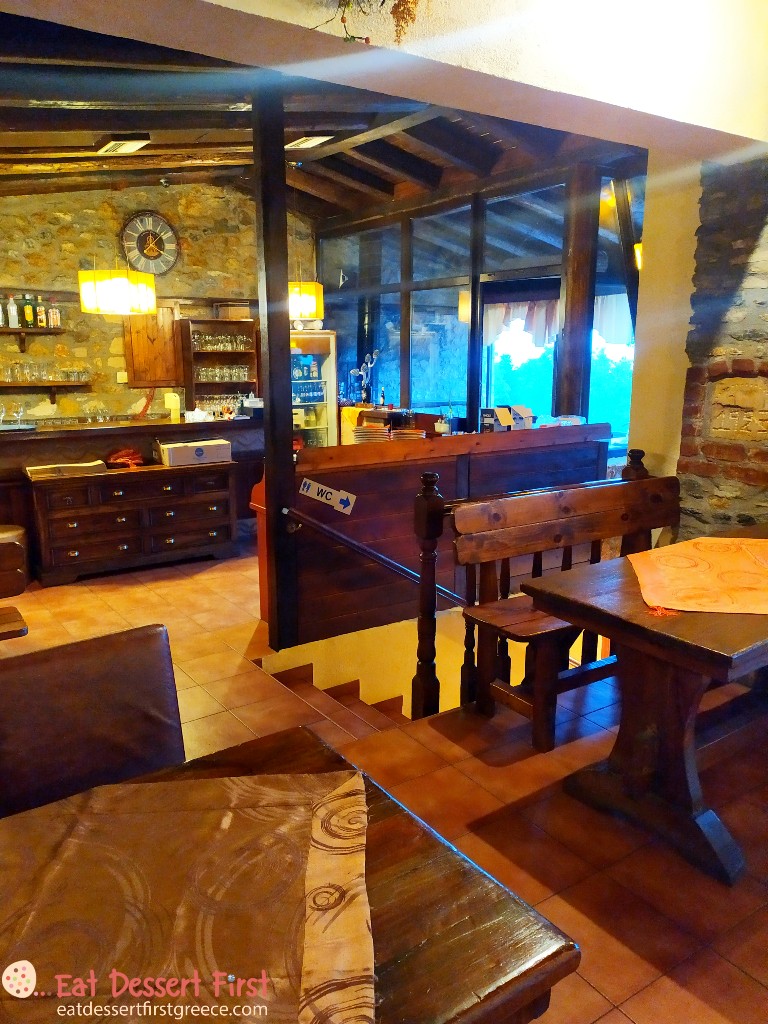 Το Ανώι έχει έναν όμορφο εξωτερικό χώρο, μέσα στο πράσινο, αλλά το βραδάκι ήταν αρκετά κρύο, κι έτσι επιλέξαμε να καθήσουμε μέσα. Η ταβέρνα είναι όμορφα διακοσμημένη, με ξύλο και πέτρα, υλικά που δημιουργούν μια ζεστή ατμόσφαιρα. Πόσο μάλλον όταν ανάβει και το μεγάλο τζάκι του πάνω ορόφου!