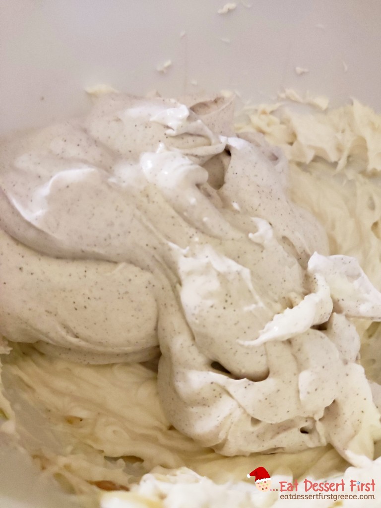 Ενώνουμε τη σαντιγί με το τυρί κρέμα με μια σπάτουλα, κάνοντας απαλές κυκλικές κινήσεις.