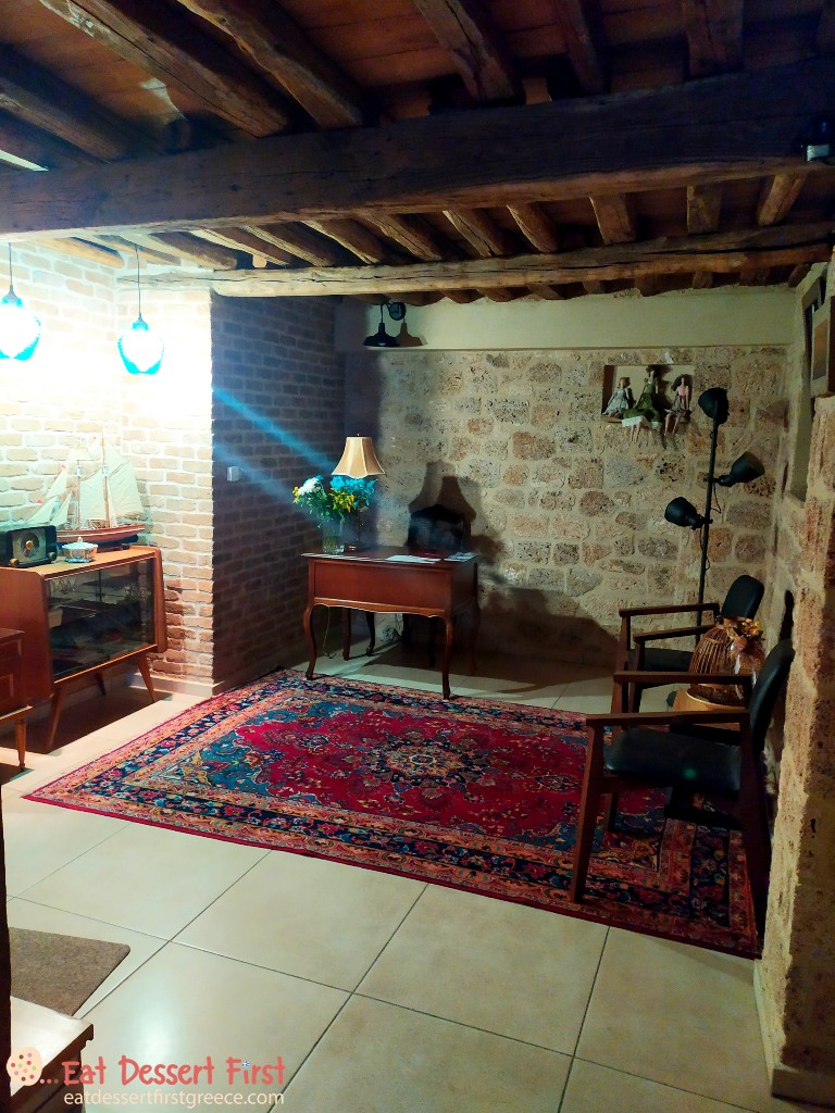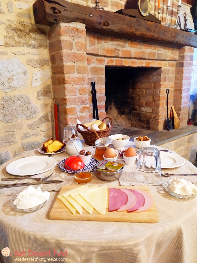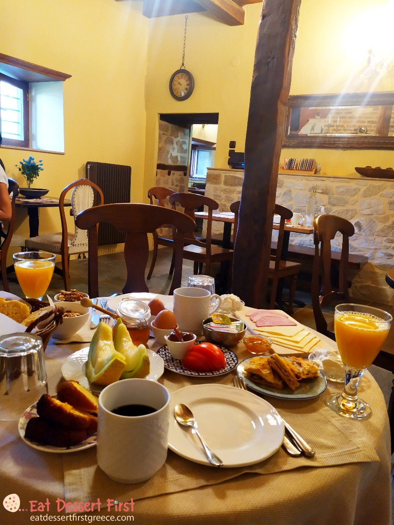 The next morning the Kokkino Spiti breakfast awaited us, in the elegant, beautifully decorated area of its dining room. With old furniture, wooden floors and ceilings, small wooden tables and a large fireplace in the main area, the atmosphere was friendly and warm, perfect to start your day.