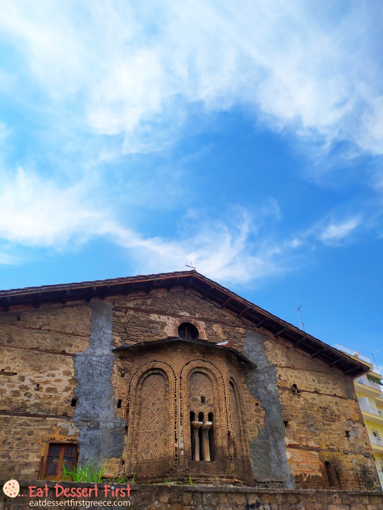 After spending some time inside the museum, we continued our wandering in the streets of Veria. Near the Byzantine Museum, we came by Saint Savvas of Kyriotissa, one of the most important Byzantine monuments of the city. As we read, it was built in the middle of the 14th century and underwent successive reconstructions until the beginning of the 19th century. From the original temple, only the eastern wall has been preserved, the dividing walls of the area of the intention and the deaconry, as well as the niche of the sanctuary with the impressive exterior ceramic decoration.