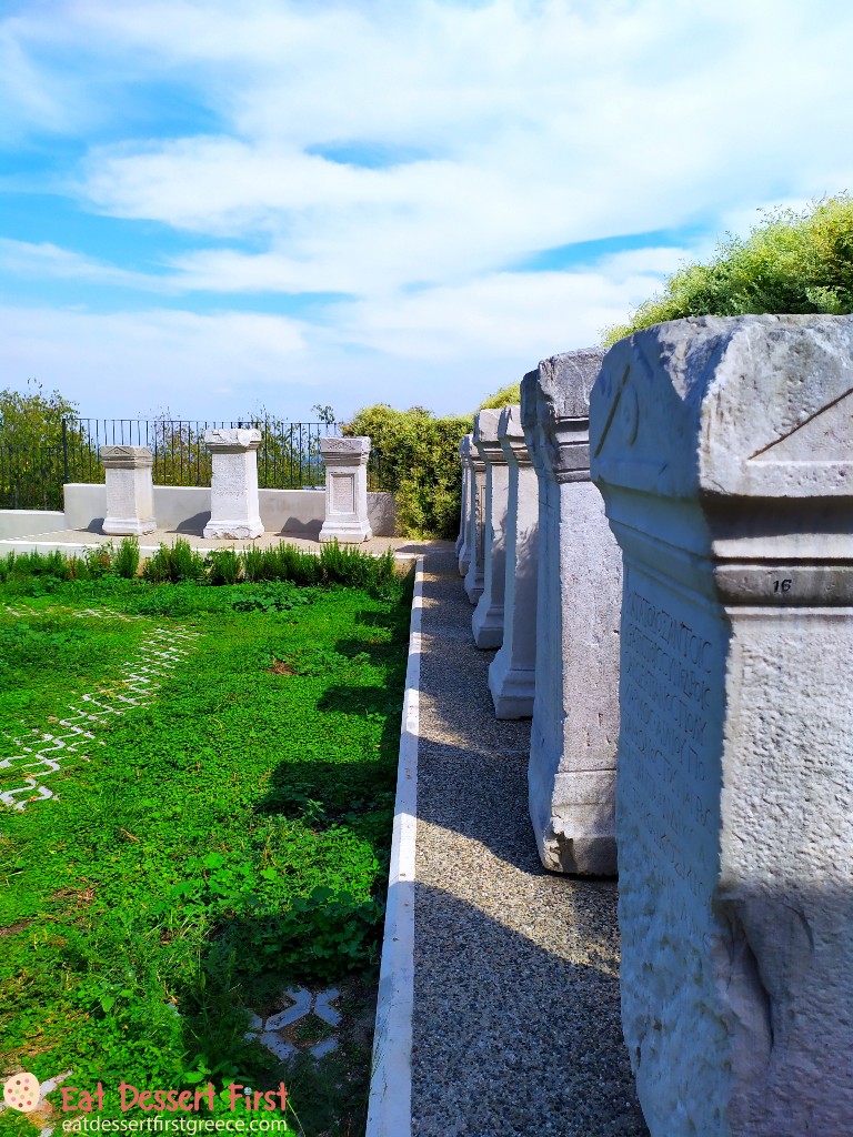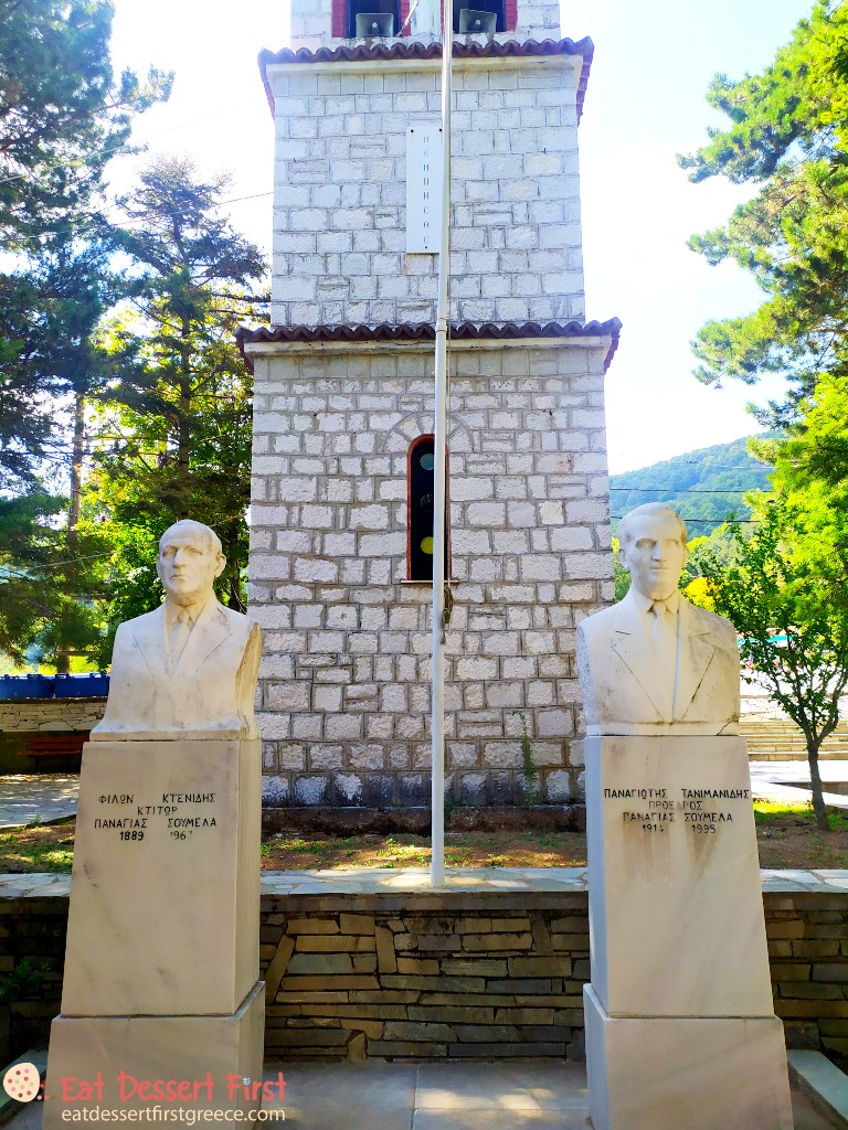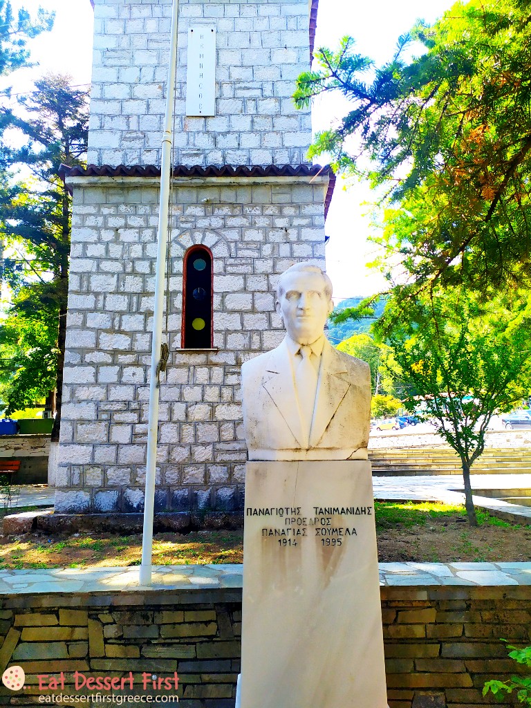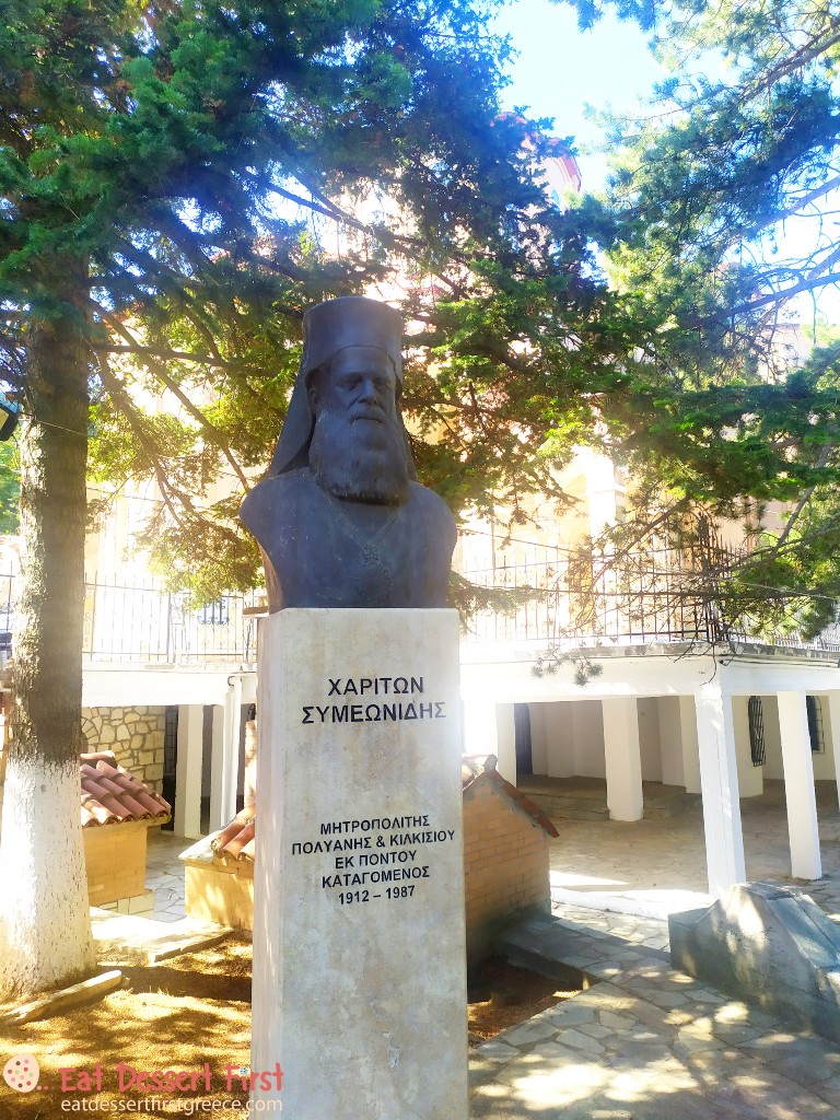 Behind the big church, we were told, is the bust of Chrysanthos Filippidis, the last Metropolitan of Trebizond, who refused to swear in the pro-German government in ’42 and was fired for this reason. He died in 1949 and his bones and the bust are in the area. Below are the tombs of Filonas Ktenidis, Panagiotis Tanimanidis and the monk Ambrosios. A tribute has been made to Leonidas Iasonidis, Minister with an important role in the transfer of the relics of the monastery of Pontus.